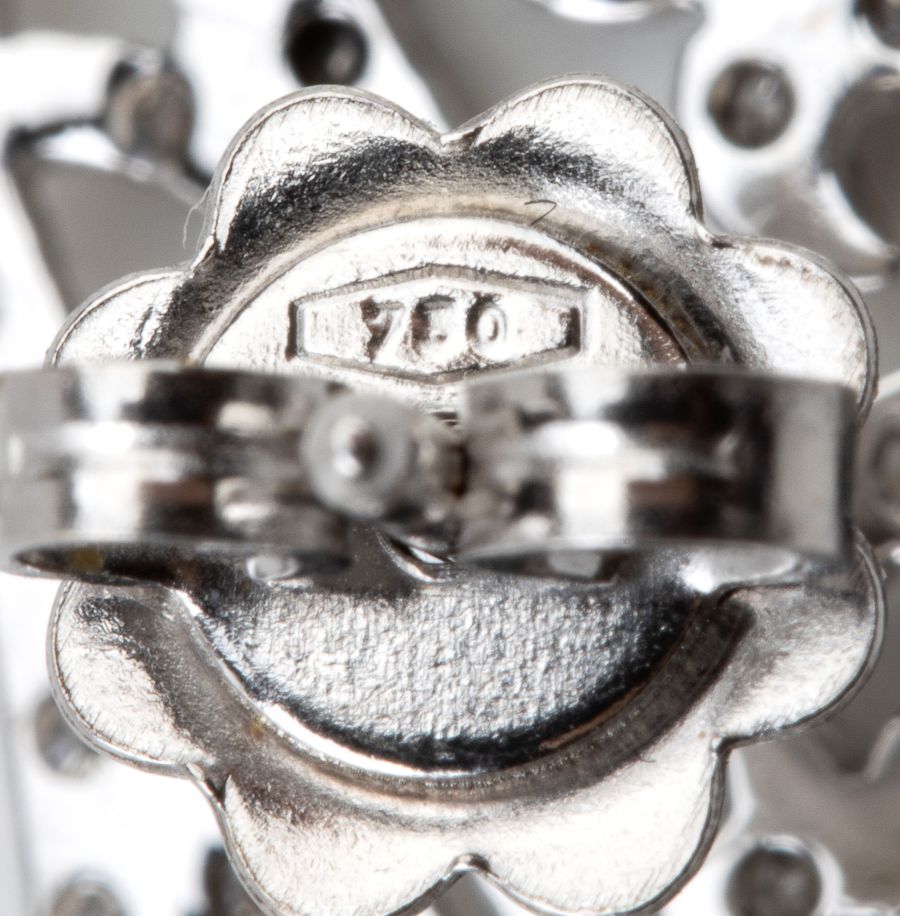 oro bianco 18k, con motivo a volute di nastri in moissaniti e paste vitree.
