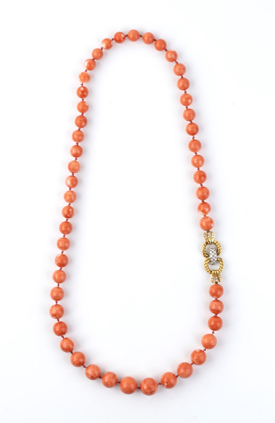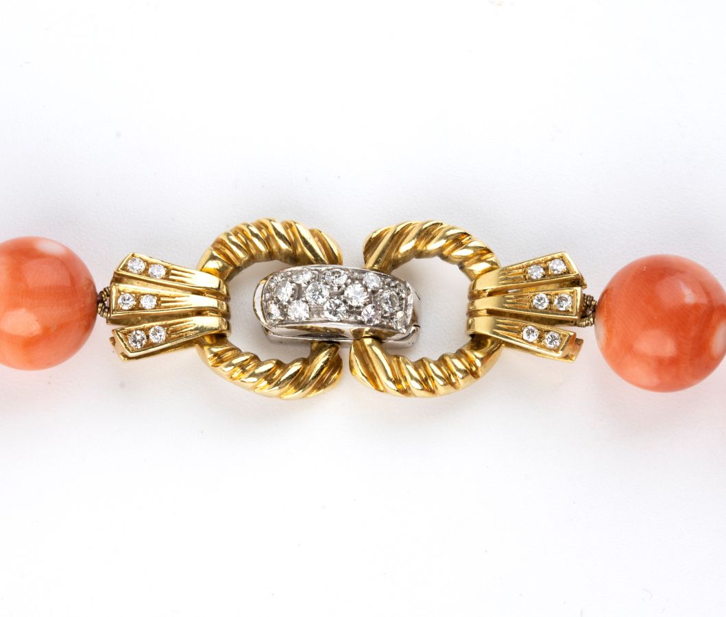ad un filo di sfere di corallo cerasuolo (Corallium Elatius), disposte in gradazione, con fermezza in due colori d'oro, impreziosita da diamanti.