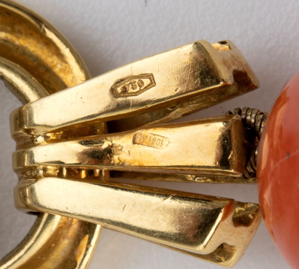 Diametro sfere di corallo da 9,5 a 13,5 mm. Punzonato "750 - 1081 AL". Lunghezza 67 cm. Peso 98,3 gr.