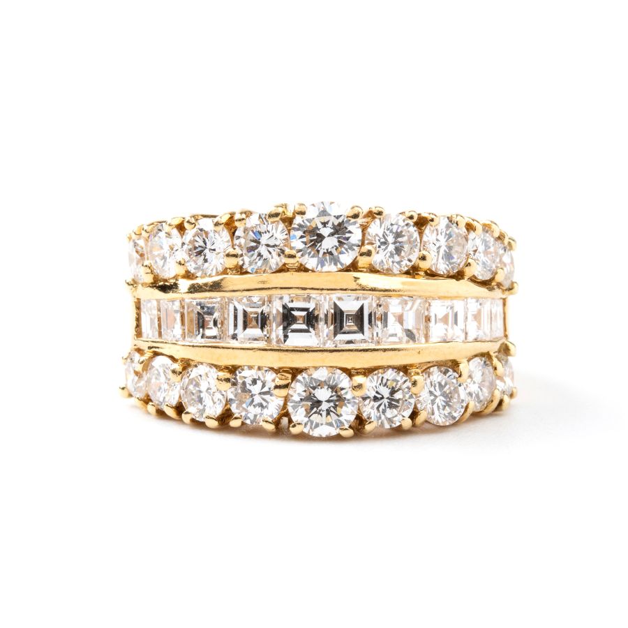 in oro giallo 18k, incastonato con linea centrale di diamanti carré profilati da diamanti rotondi taglio brillante per circa 2.30 ct totali, F-G, IF-VVS.