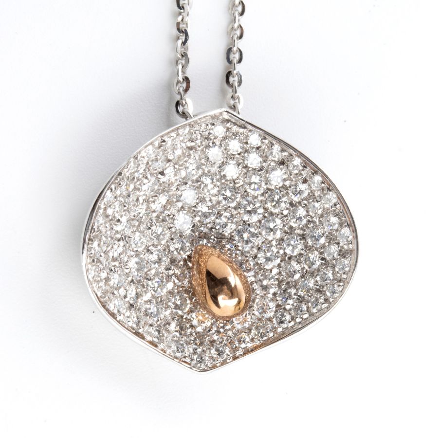 in oro bianco e rosa 18k, con catena a maglia forzatina a cui è sospeso un pendente raffigurante un fiore in pavé di diamanti rotondi, taglio brillante, circa 3.00 ct, E-F, IF-VVS. Firmato KOESIS.