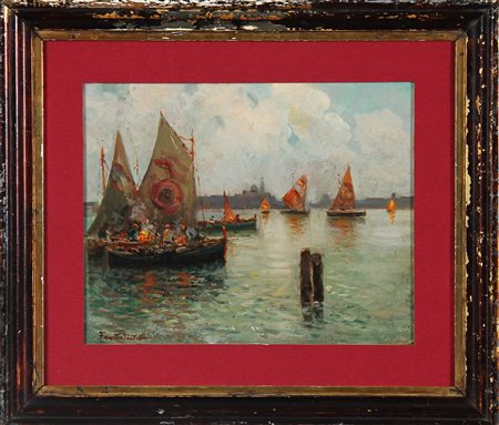 PRATELLA FAUSTO (1888 - 1964) Barche a Venezia. Olio su cartone. Cm 29,00 x 23,00. Firmato in basso a sinistra. Cornice presente