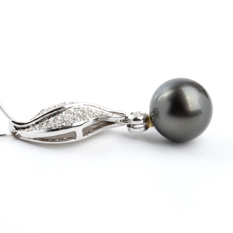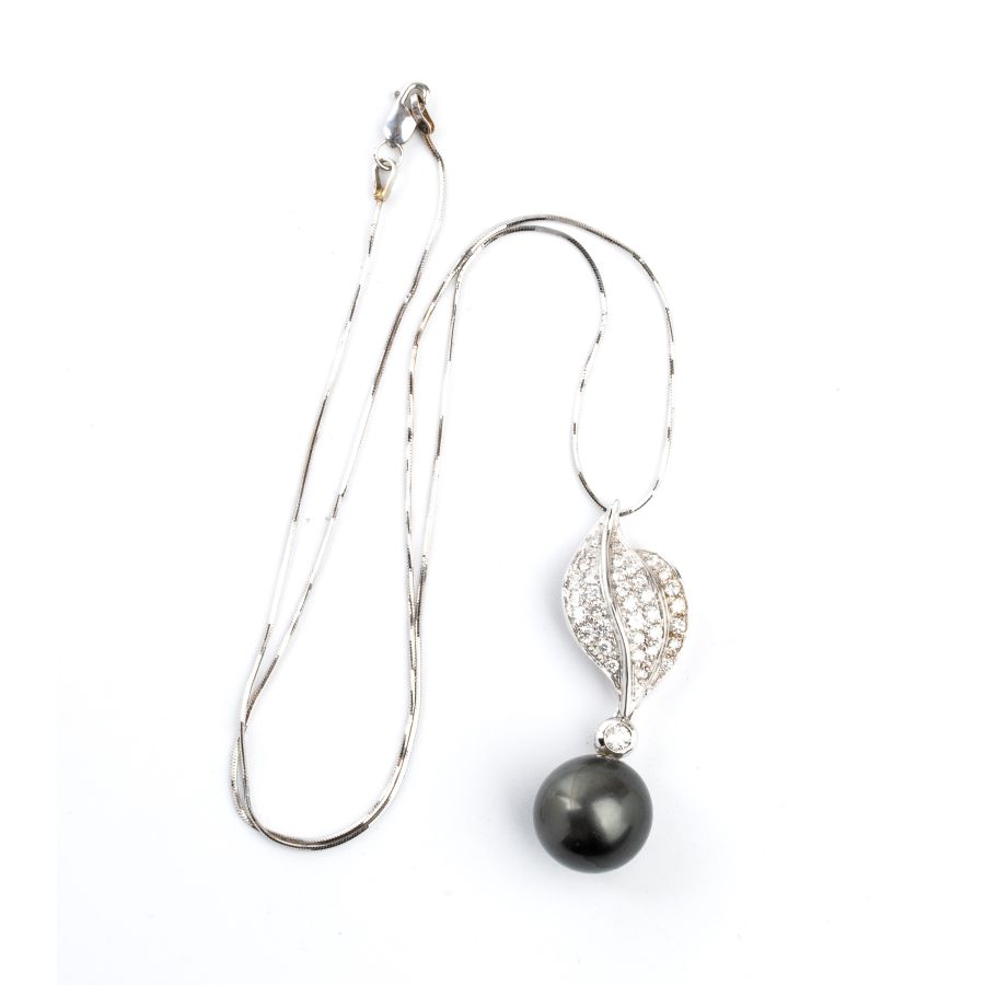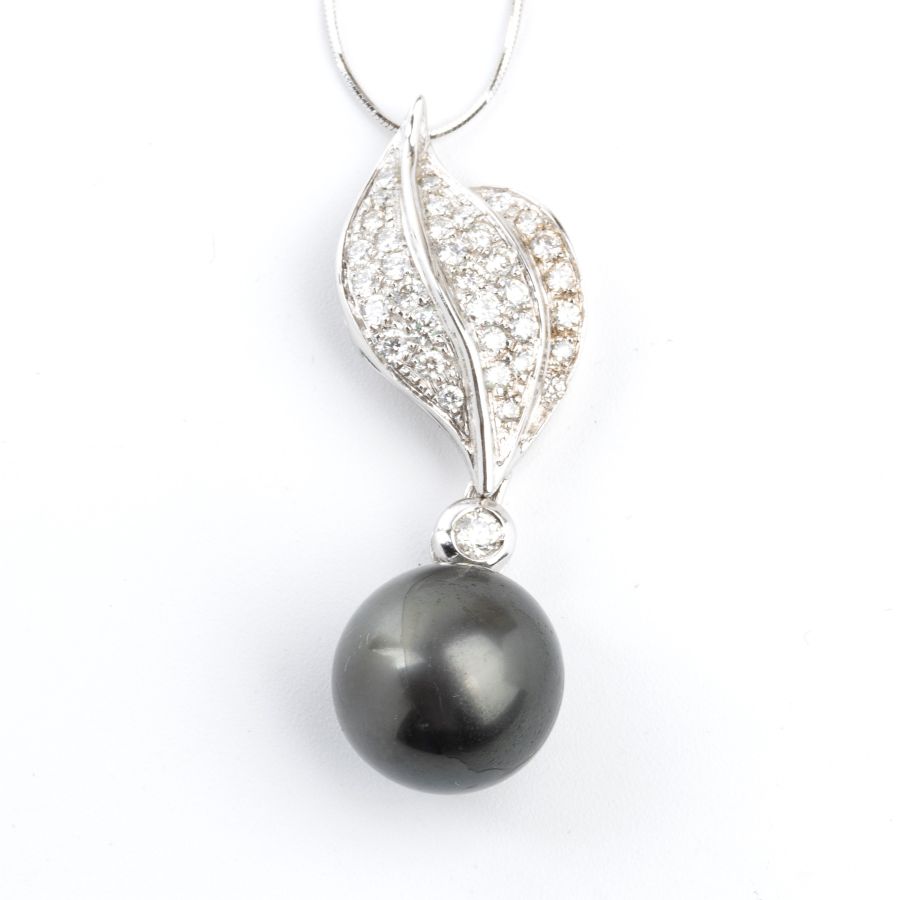 pendente con perla Tahiti sormontata da motivo a foglia in pave' di diamanti.