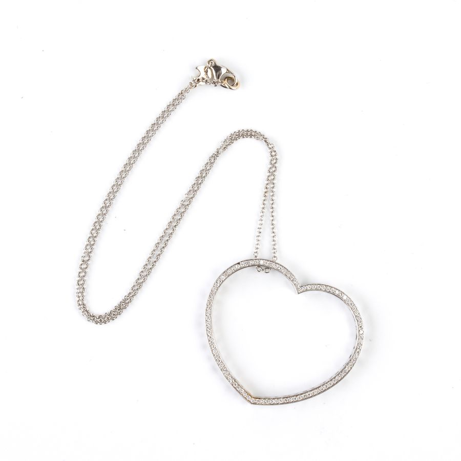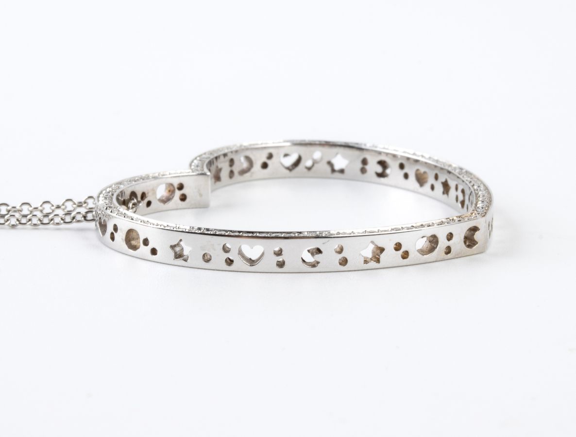 Punzonato "750 - 2241 AL - GIOIELMODA". Lunghezza catena: 41 cm. Dimensioni pendente: 4,5 x 4 cm. Peso: 14,9 gr.