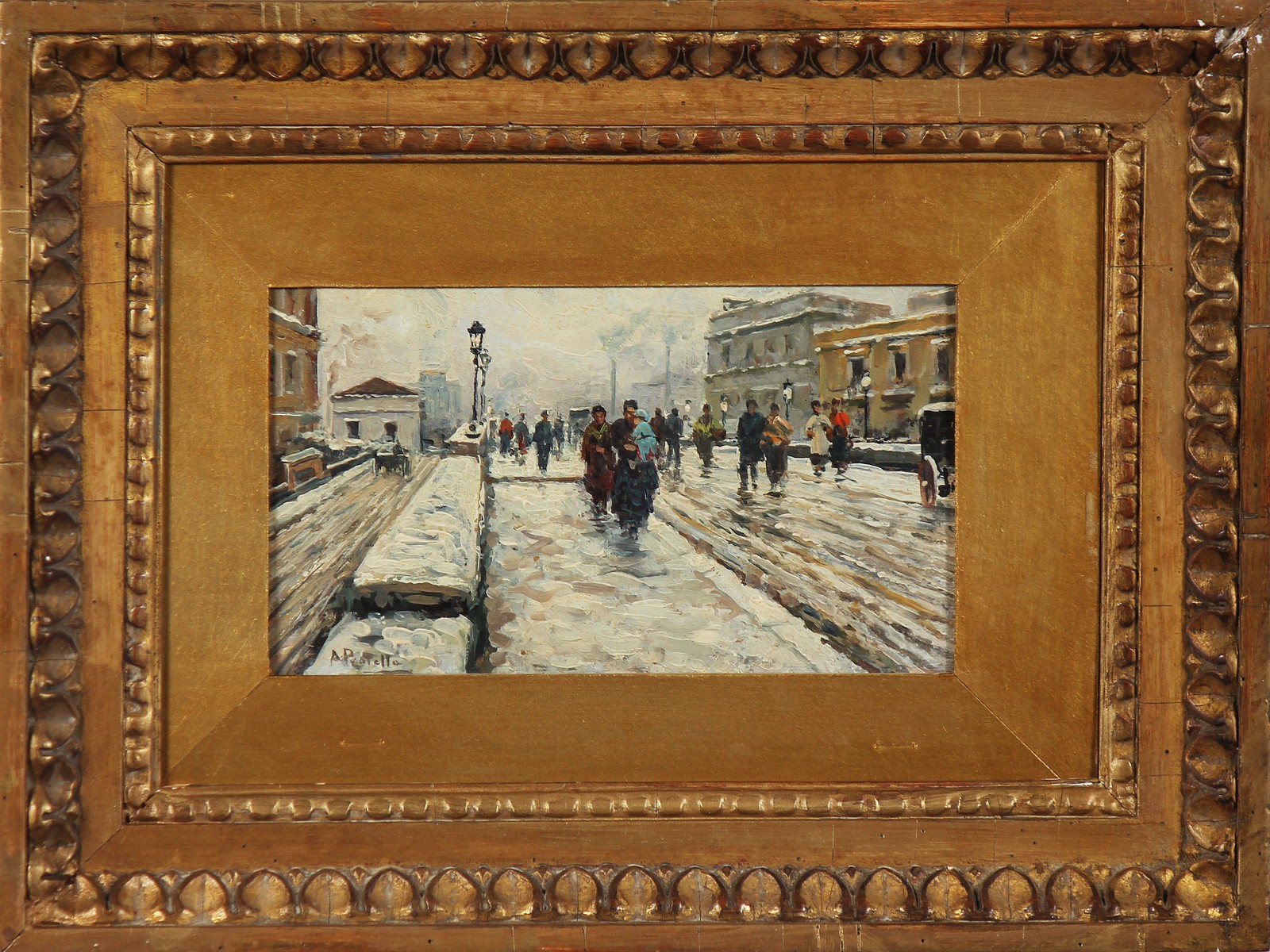 PRATELLA ATTILIO (1856 - 1949) Viale cittadino. Olio su tavola. Cm 21,50 x 12,00. Firma in basso a sinistra. Cornice presente