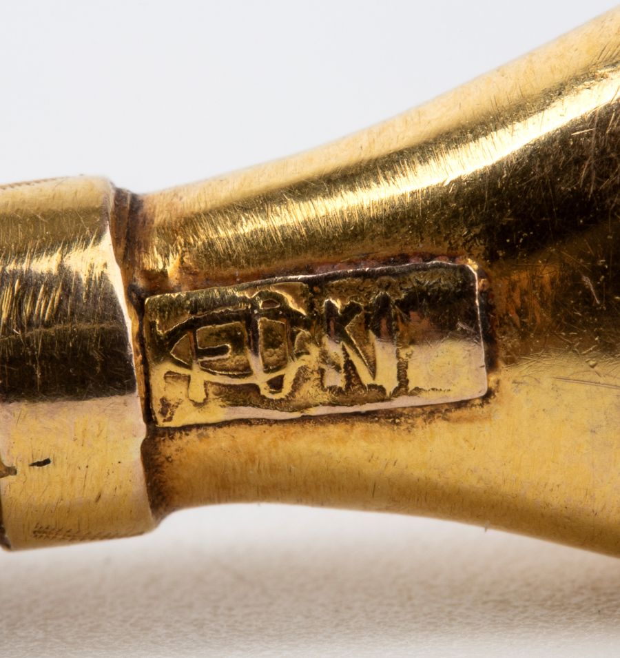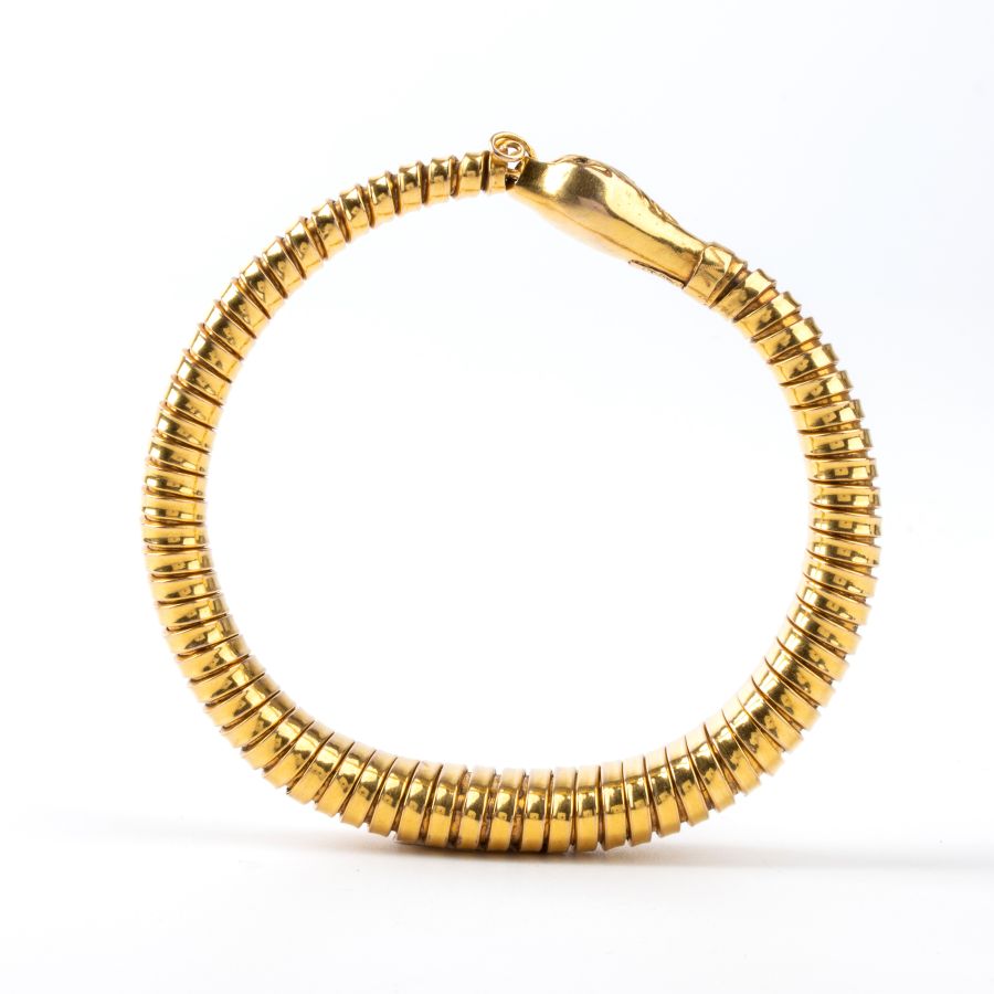 in oro giallo 12k, a forma di serpente con testa ed occhio in paste vitree.