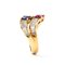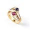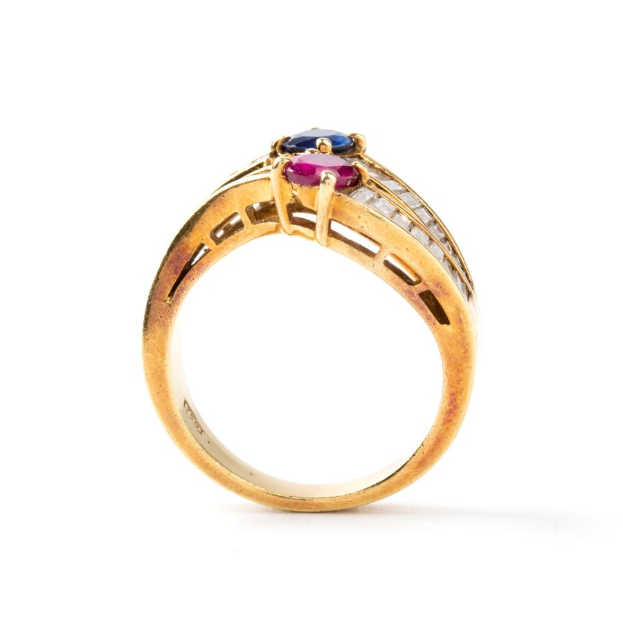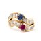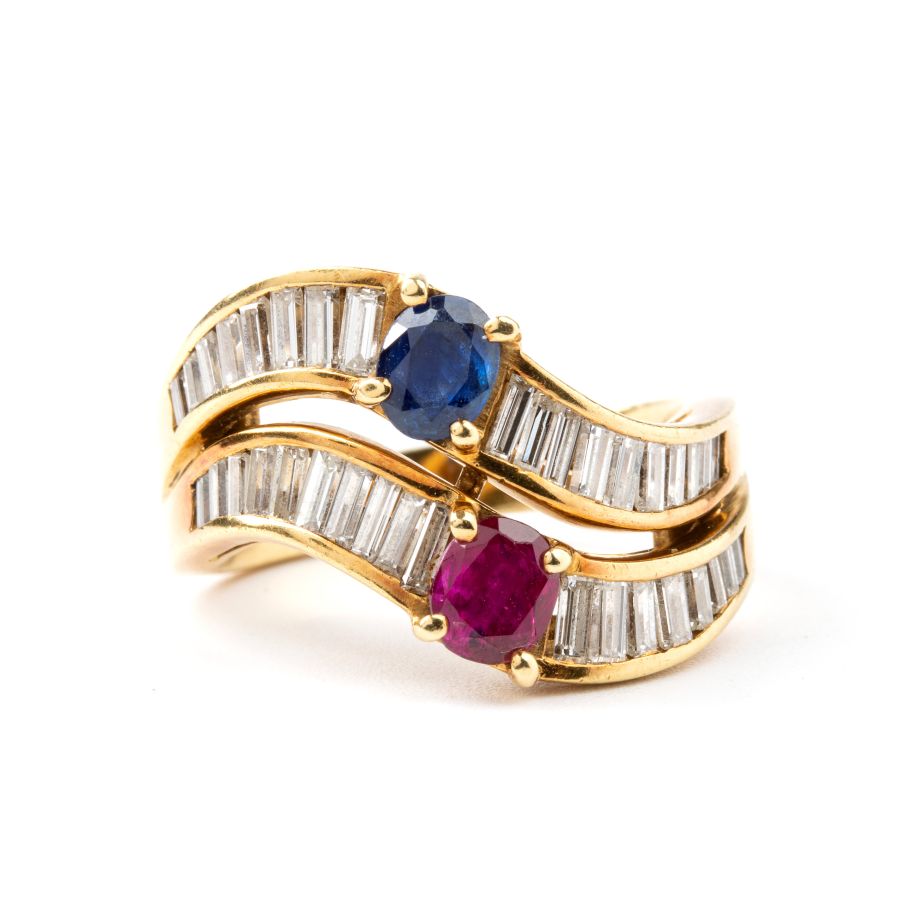 con motivo di doppia onda in oro giallo 18k, incastonato con rubino e zaffiro affiancati da diamanti.