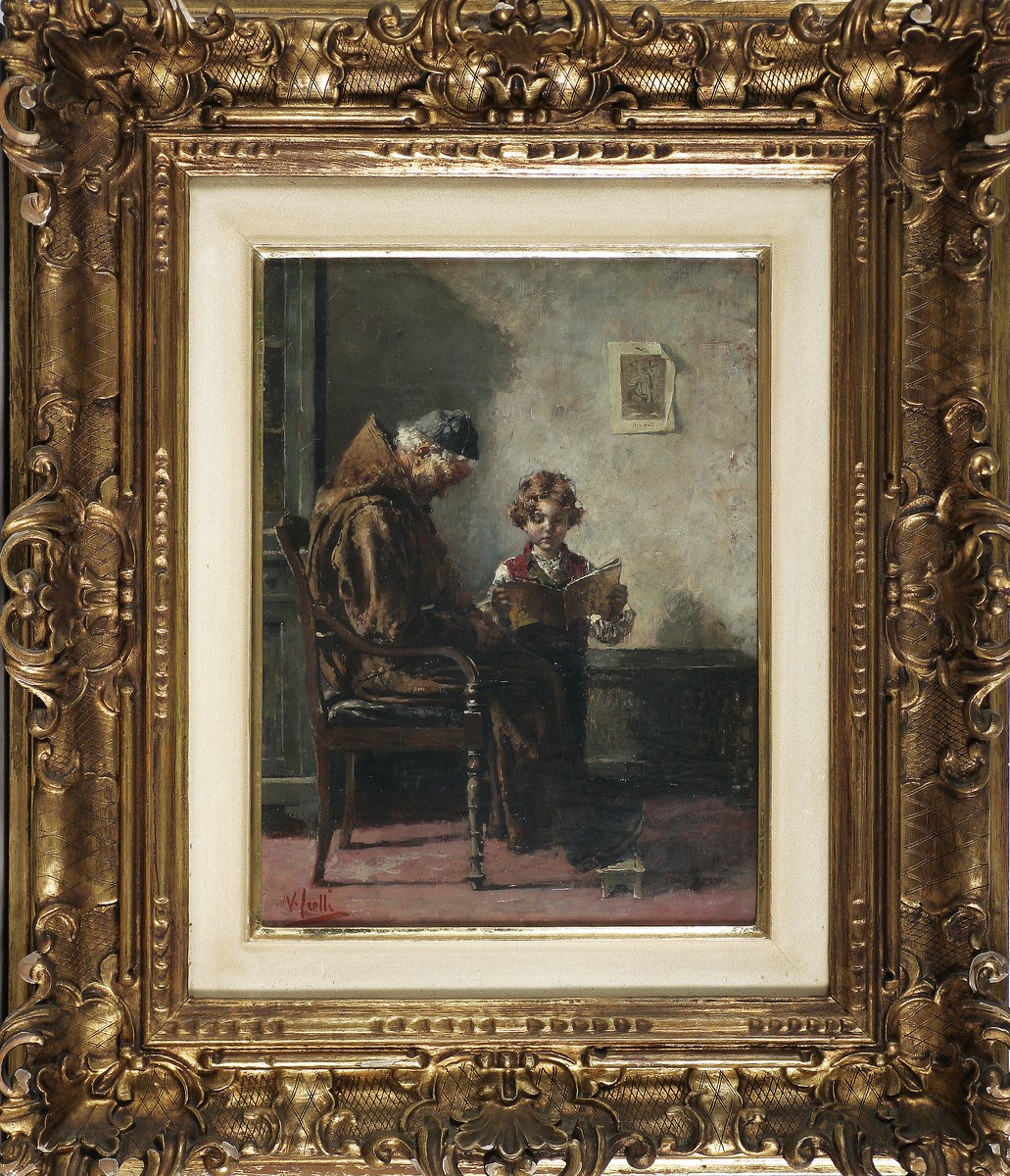 IROLLI VINCENZO (1860 - 1942) La lettura. Olio su tela . Cm 30,00 x 40,00. Firma in basso a sinistra.