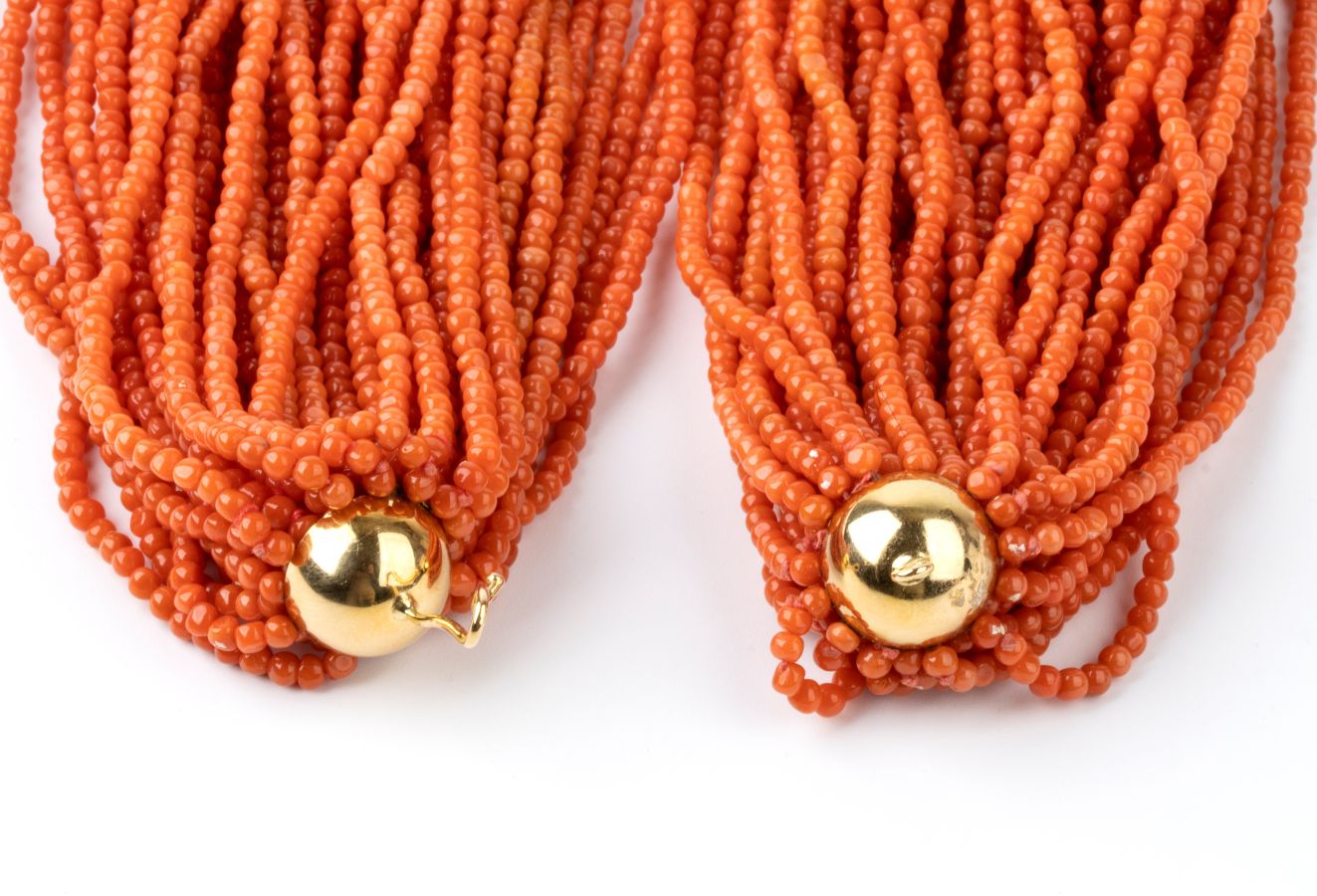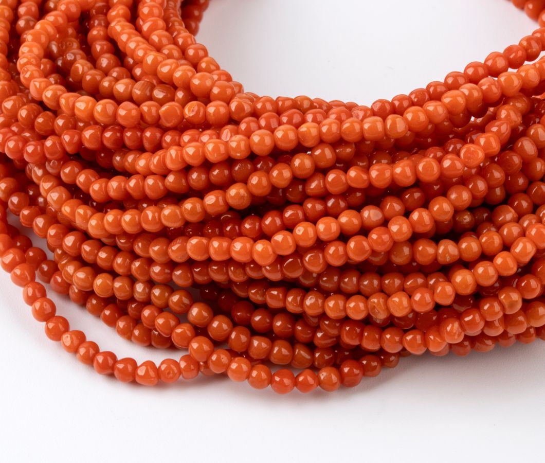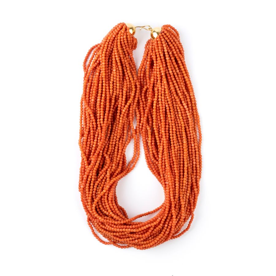 a 48 fili di piccole sfere di corallo Mediterraneo (Corallium Rubrum) con fermezza in oro giallo 18k.