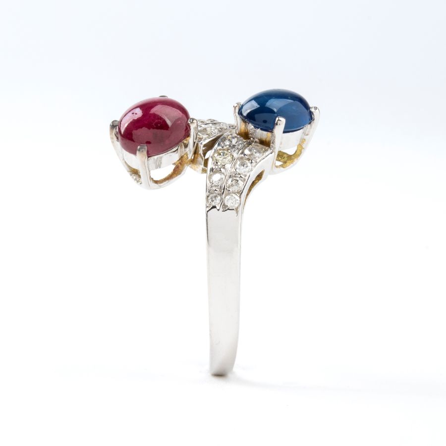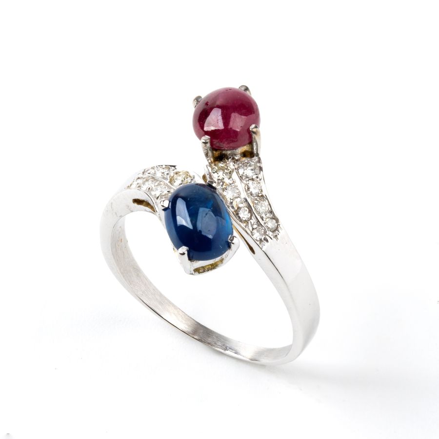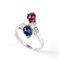 Anello contrarié in oro con rubino, zaffiro e diamanti