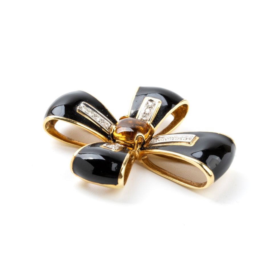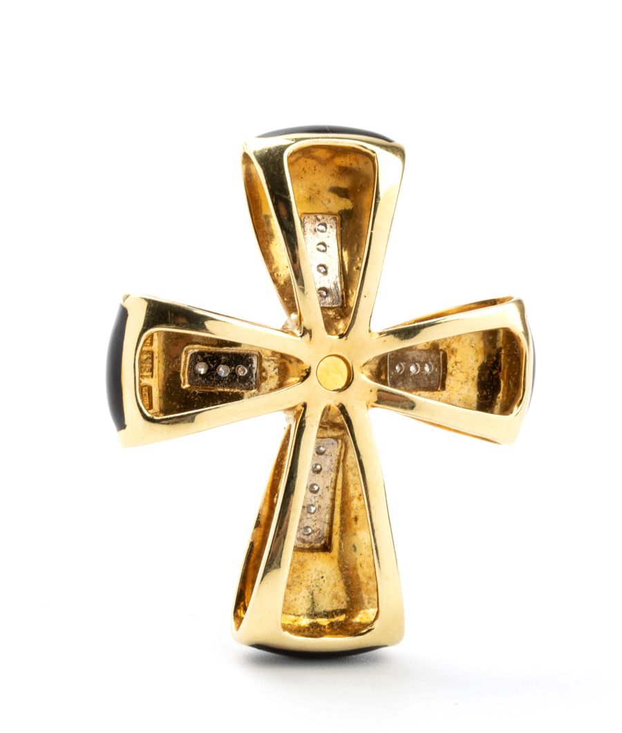 Pendente a forma di croce latina in oro con smalto nero, diamanti e quarzo citrino