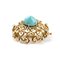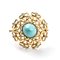 in oro giallo 18k, motivo a rosone con volute di sottili nastri, incastonata con cabochon di turchese contornata da diamanti.