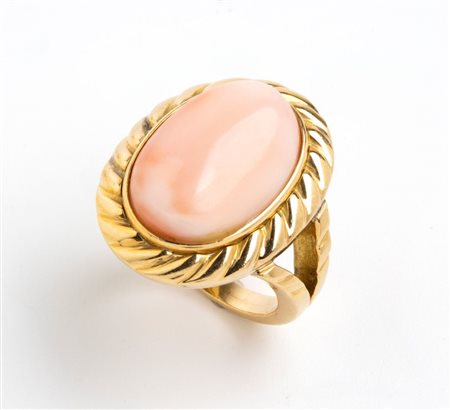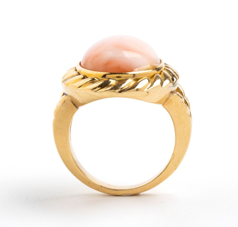 incastonato con cabochon ovale di corallo "Deep Sea" (corallium laauense) tra godronatura che ne forma il castone.