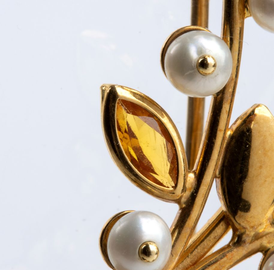 in oro giallo 18k, a motivo di steli, foglie e fiori in perle coltivated'acqua dolce e paste vitree. Diametro perle 3 - 3,5 mm.
