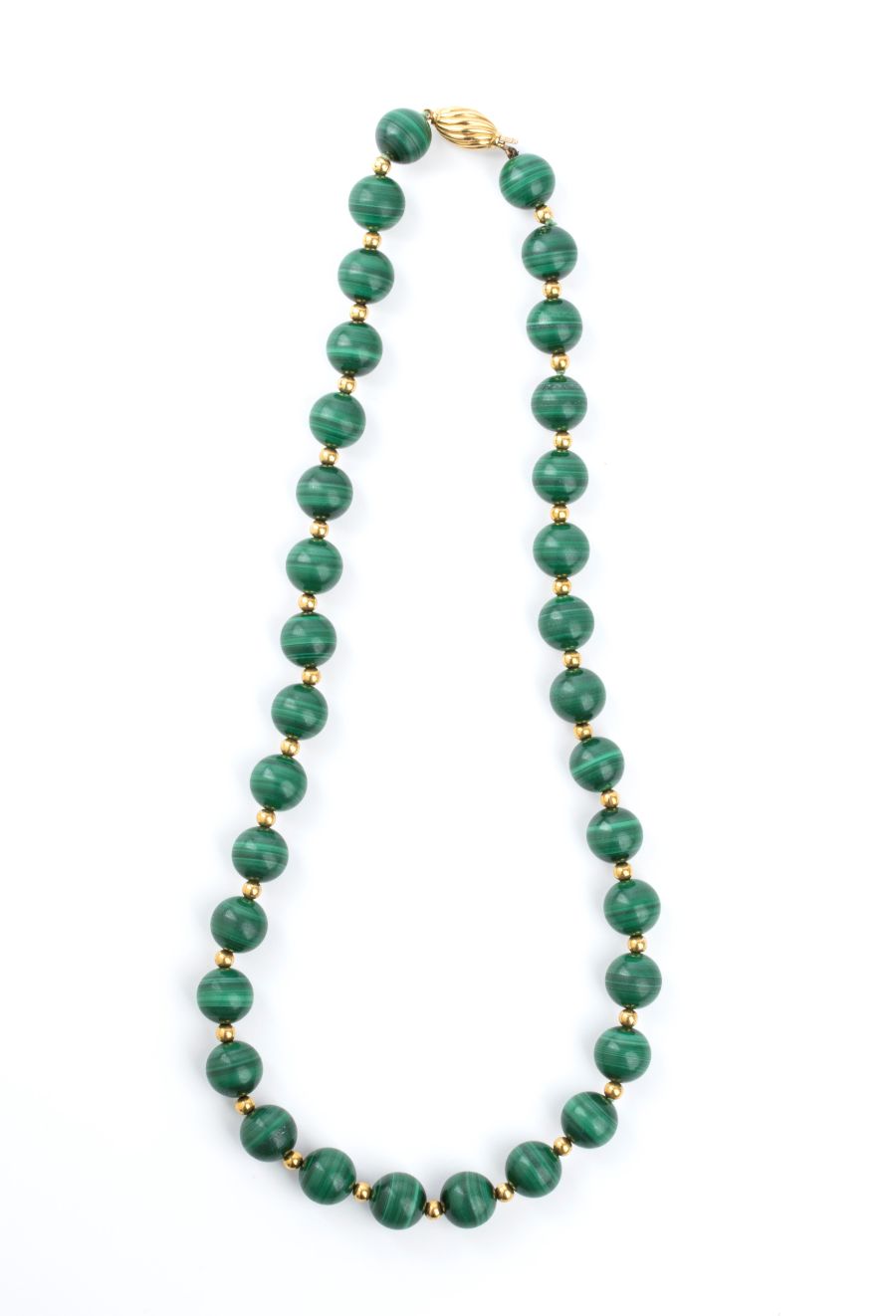 Composto da un filo di sfere di malachite separate da piccole sfere distanziali in oro giallo 18k.