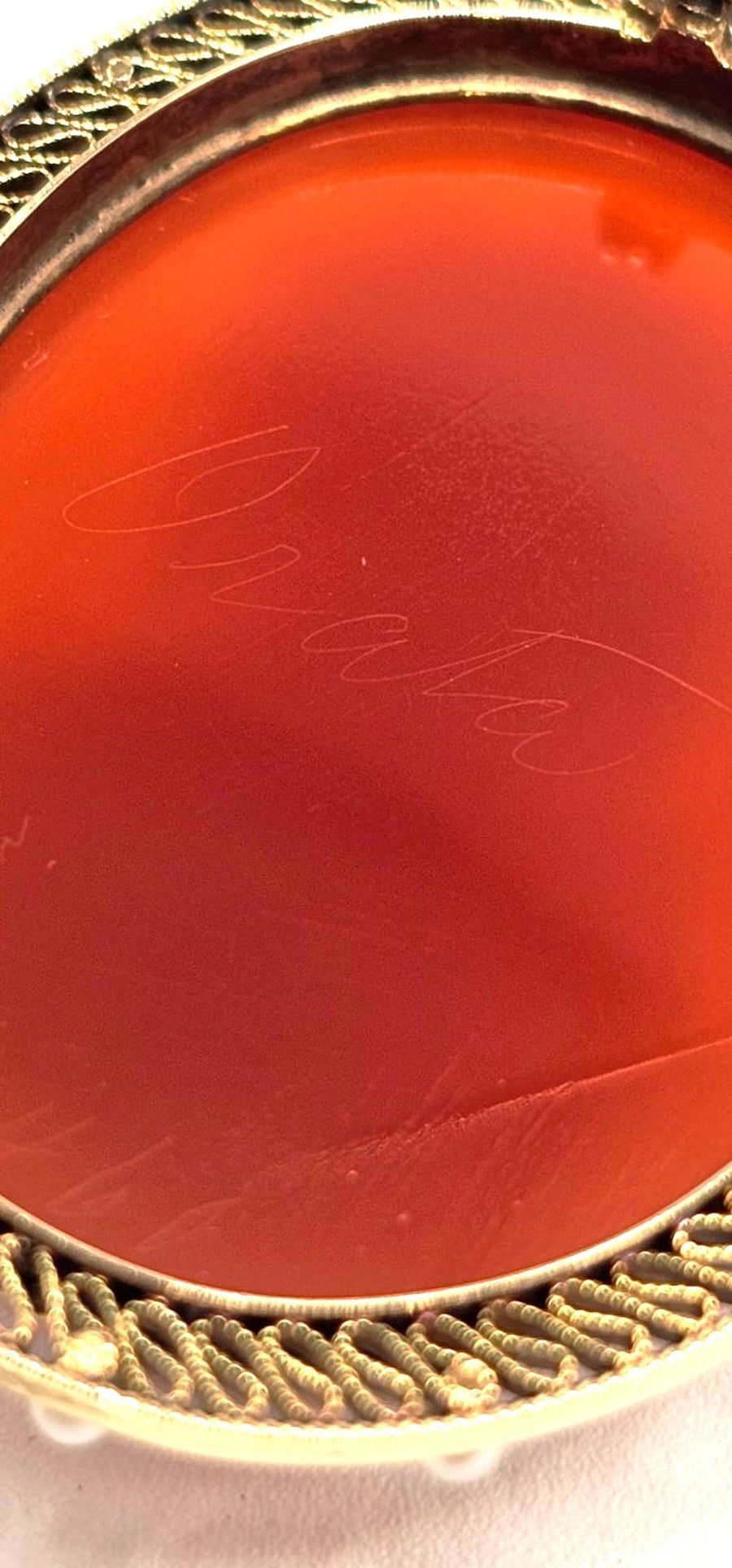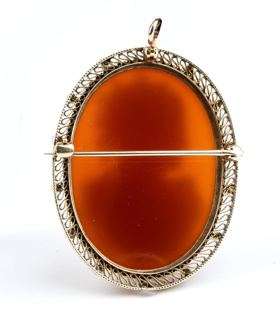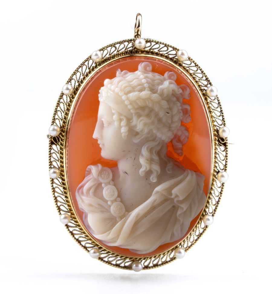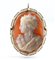 cammeo su conchiglia raffigurante profilo femminile in costume ed acconciatura classica, montatura traforata in oro giallo decorata da piccole perle.
