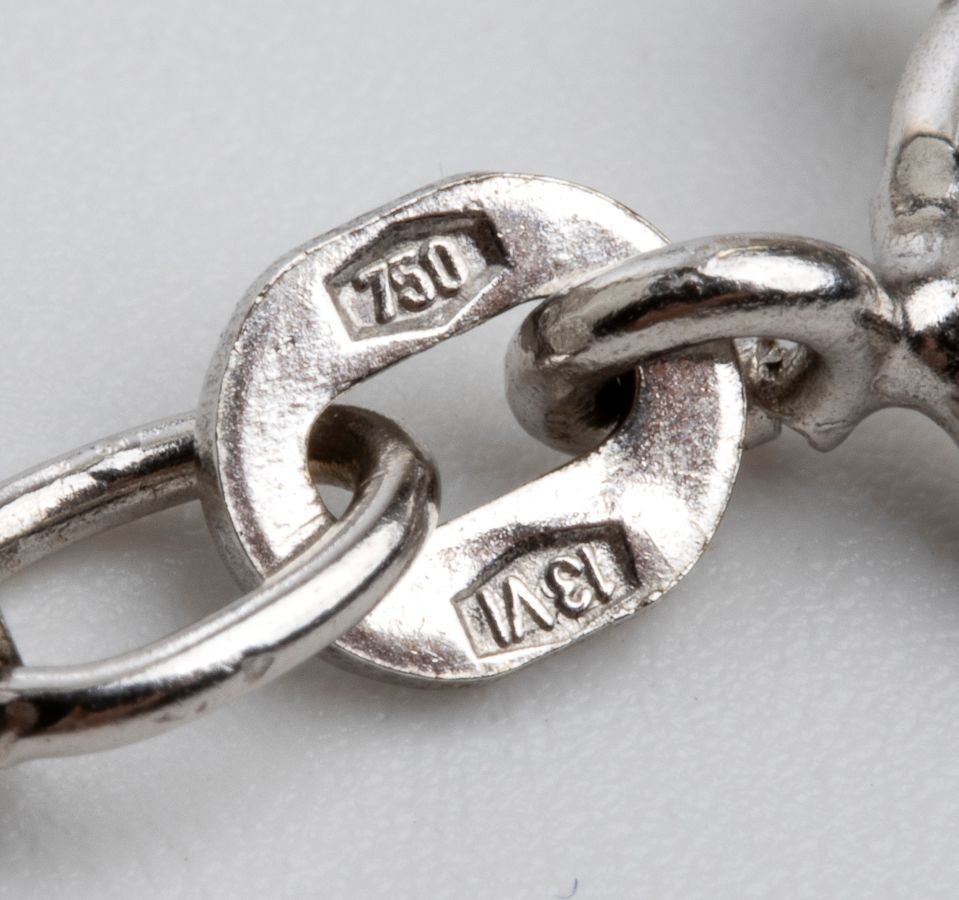 Catena punzonata "750 - balestra". Dimensioni pendente: 4,2 x 2 cm; lunghezza catena: 49,5 cm. Peso complessivo: 19,1 gr.