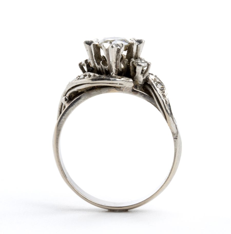diamante centrale di forma rotonda, taglio brillante, circa 0.45 ct, H-I, VS, contorno di n. 06 diamanti di forma rotonda, taglio brillante e taglio huit-huit, circa 0.15 ct, H, VVS-VS