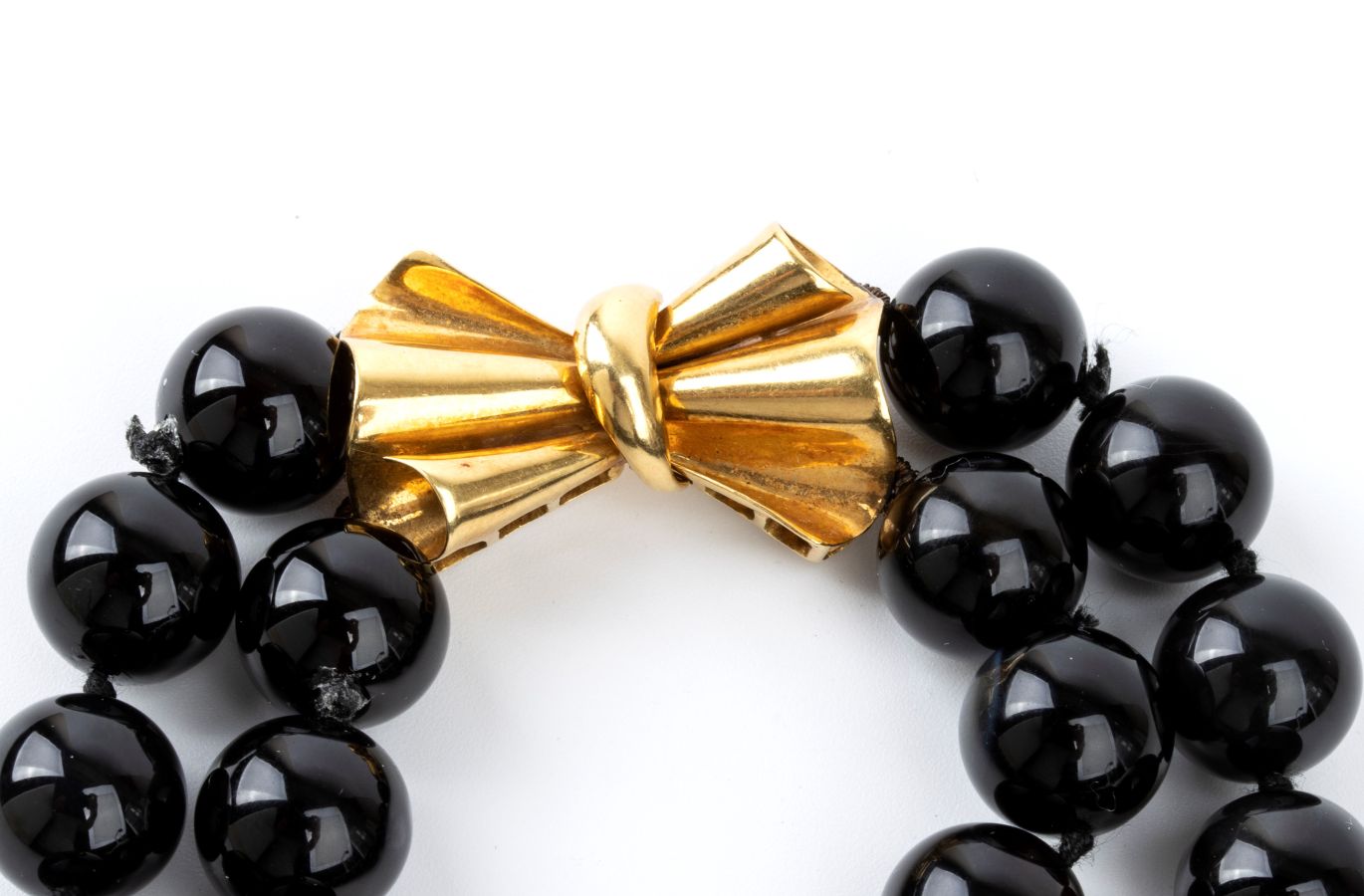 a due fili di sfere di onice con fermezza a farfalla in oro giallo 18k.
