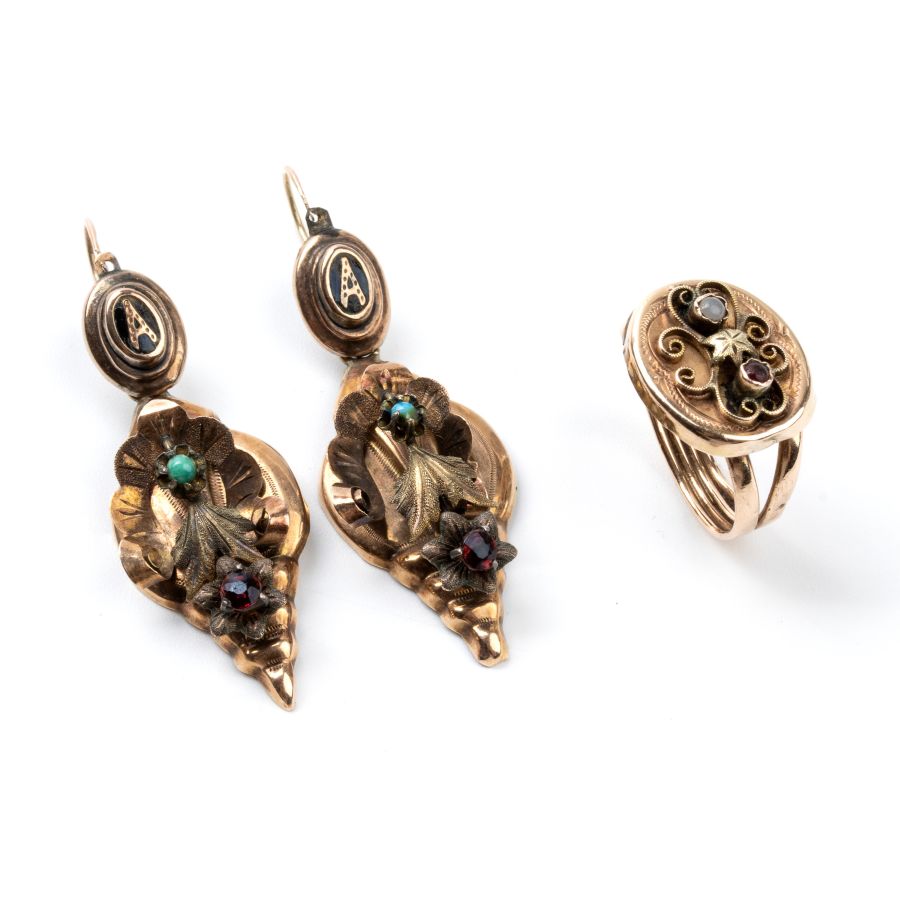 Paio di orecchini borbonici ed un anello in oro e pietre.