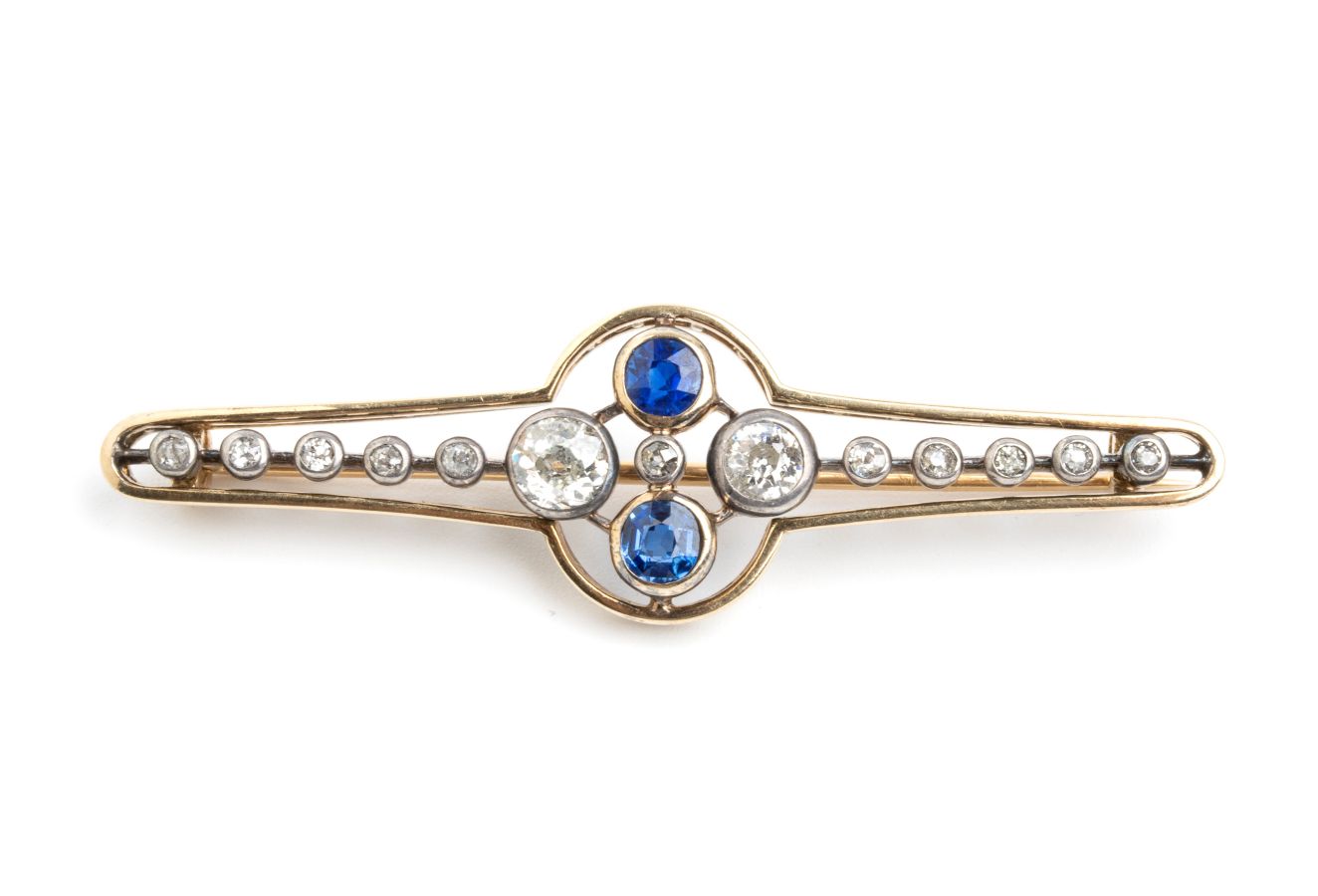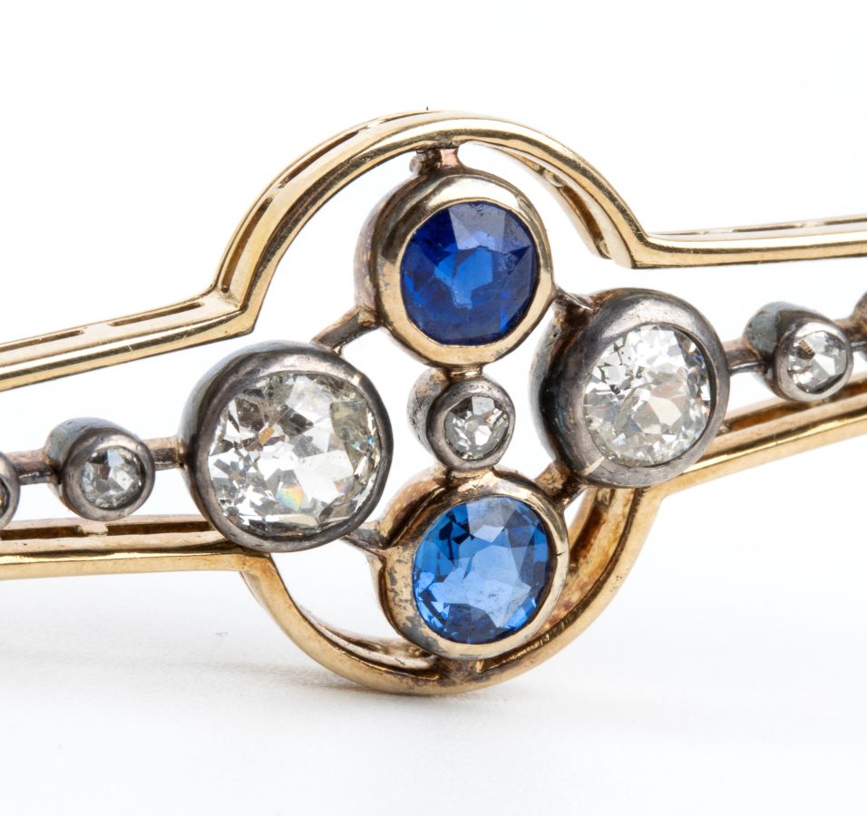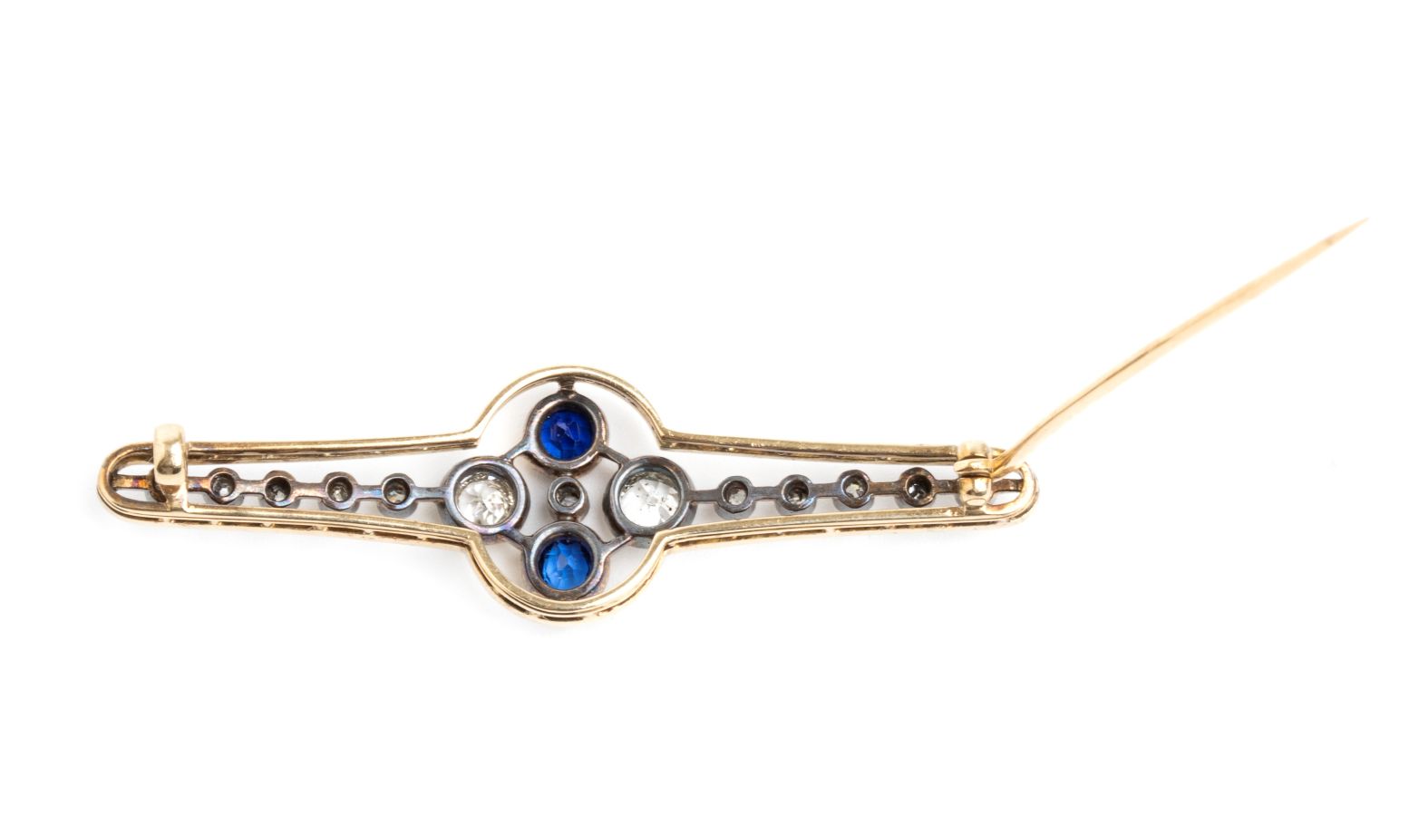 Spilla a barretta in oro, argento, diamanti e zaffiri Inizio XX secolo