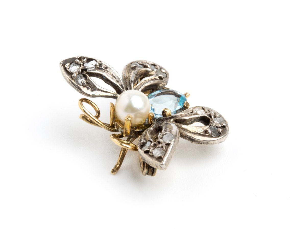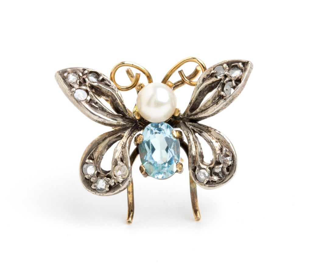 Spilla a forma di insetto in oro, argento, diamanti, perla ed acquamarina Inizio XX secolo