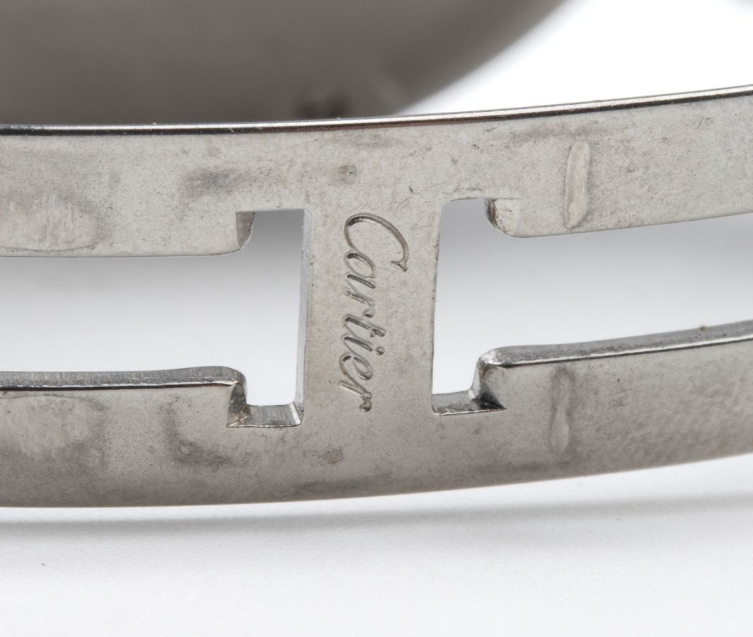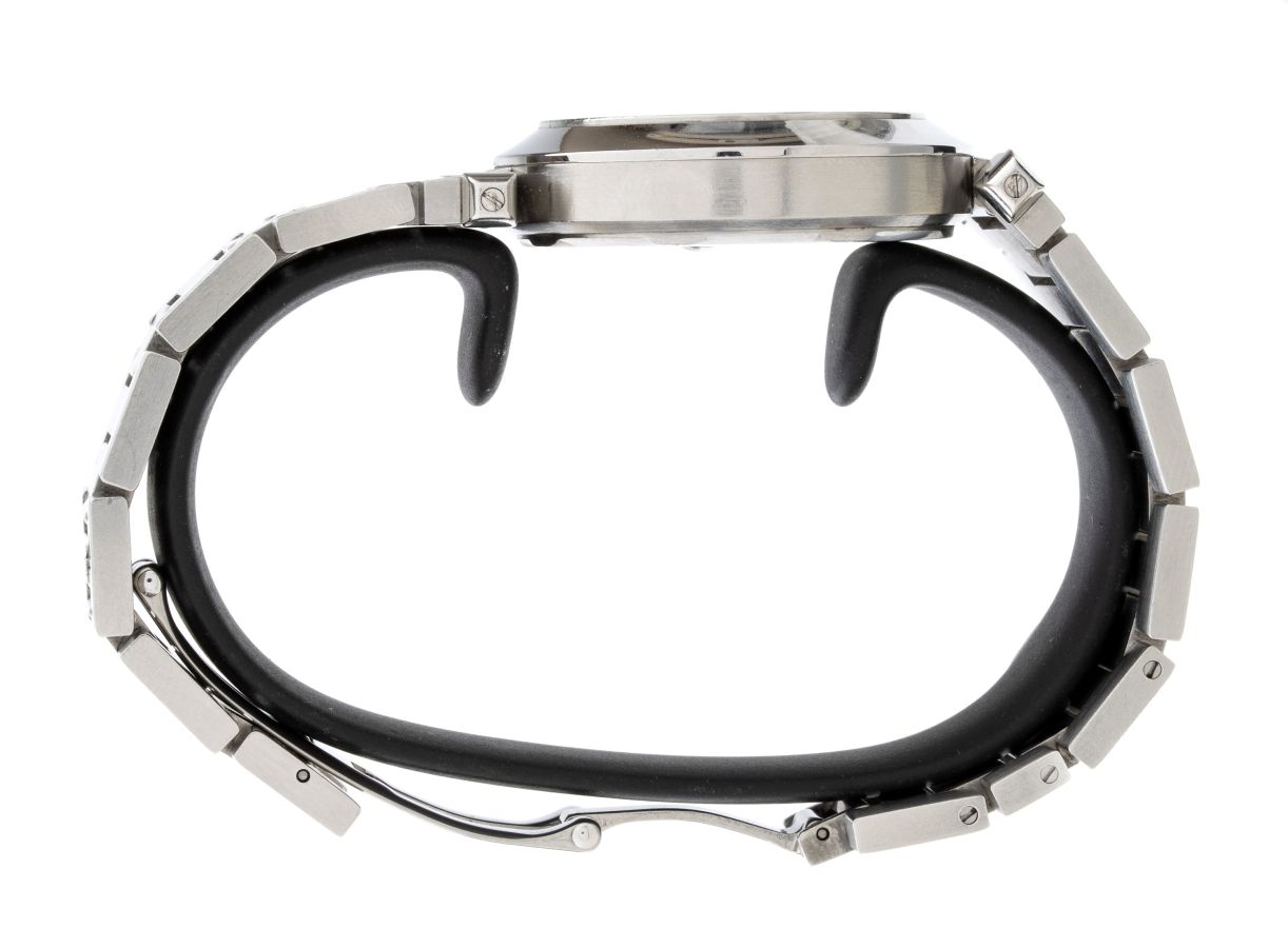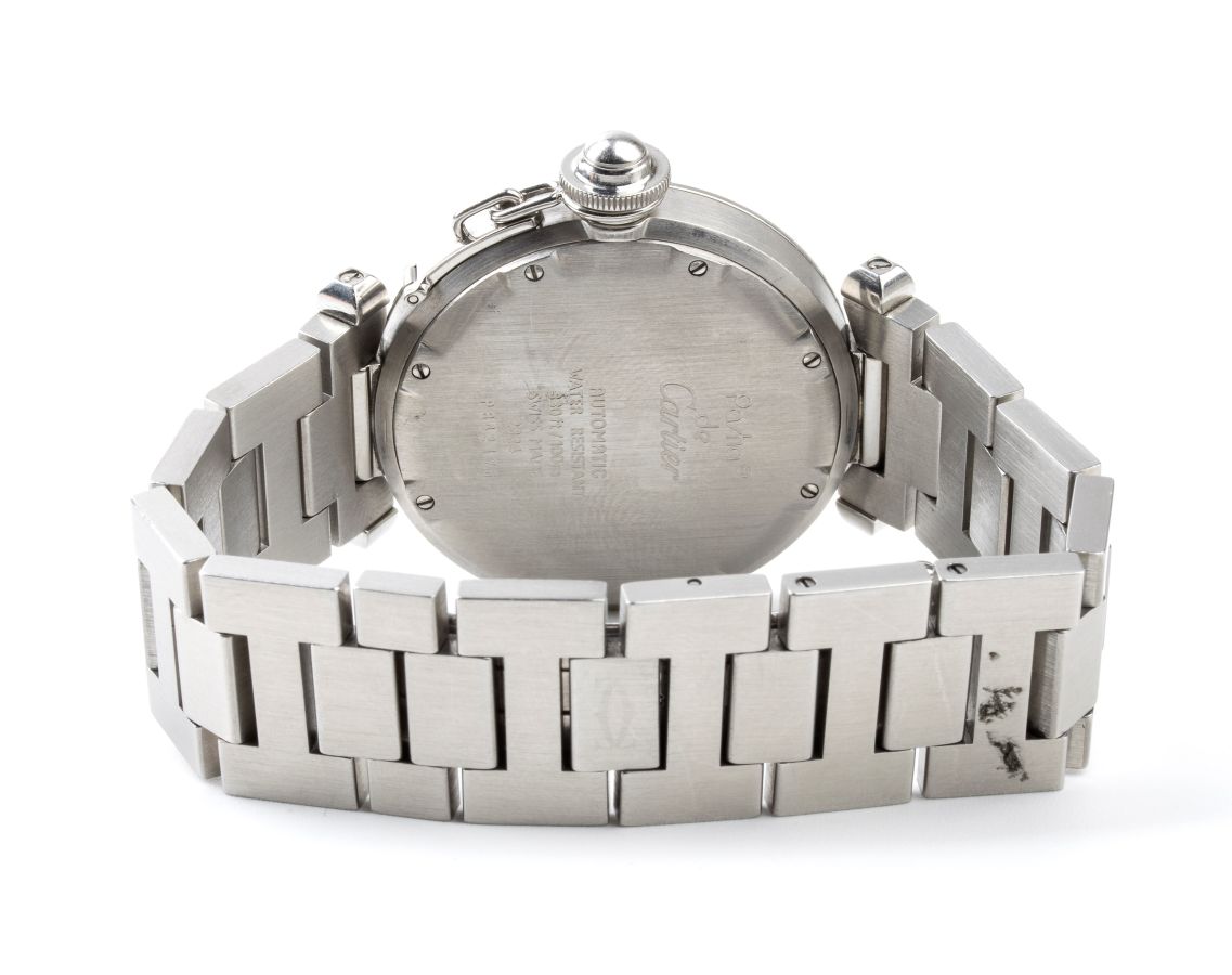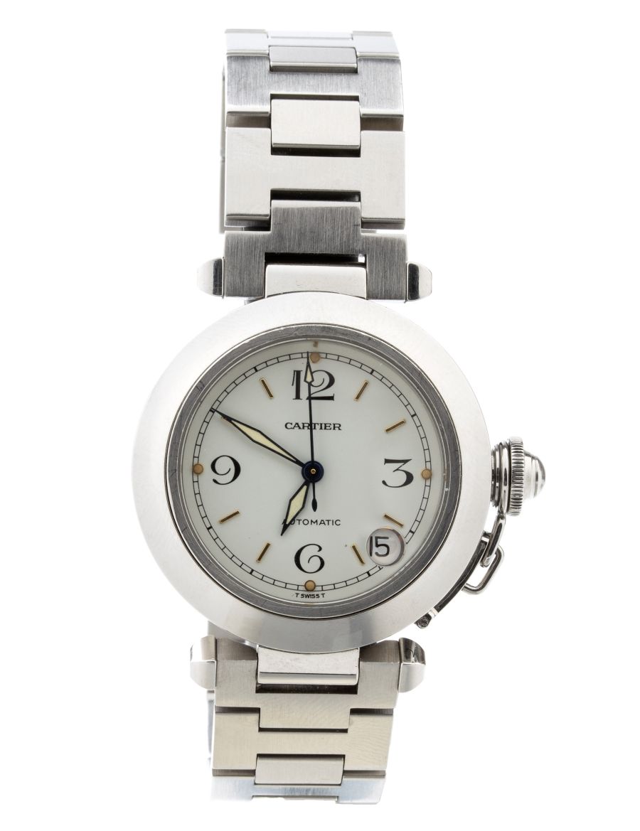 cassa e bracciale in acciaio, quadrante bianco con indici arabi, lancette Cartier luminescenti e datario ad ore 4. Movimento meccanico a carica automatica. Ref. 2324.
