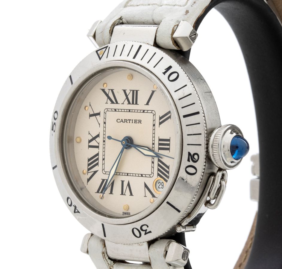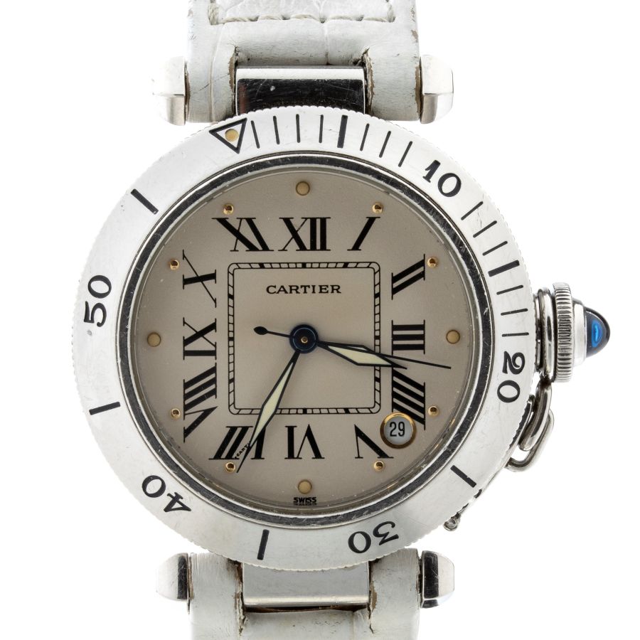 cassa in acciaio, quadrante color crema con indici romani neri, lancette Cartier, datario ad ore 5, lunetta unidirezionale girevole. Movimento meccanico a carica automatica. Ref. R40100578.