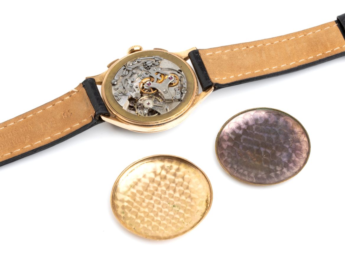 cassa in oro 18k, movimento cronografico meccanico a carica manuale Venus 170. Quadrante argenté con indici dorati e scale tachimetrica "a chiocciola". Matricola n. 527053.
