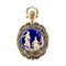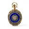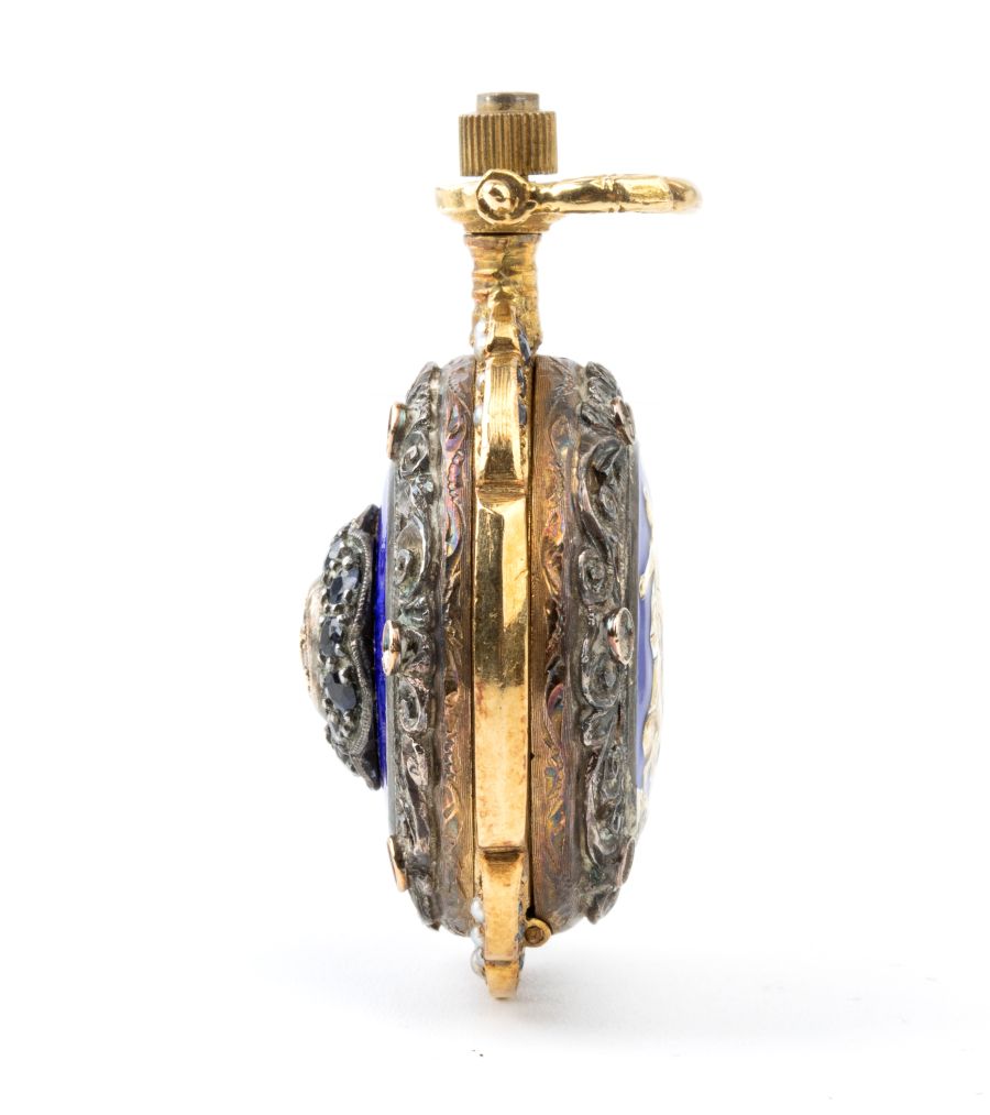 Cassa savonette in oro 18K e argeento decorata con smalti guillochè e incastonata con zaffiri, diamanti taglio huit-huit e perle fiume, quadrante dorato con numeri romani entro lunette in smalto bianco e sfere dorate firmato "Dressler 17 Rubies".