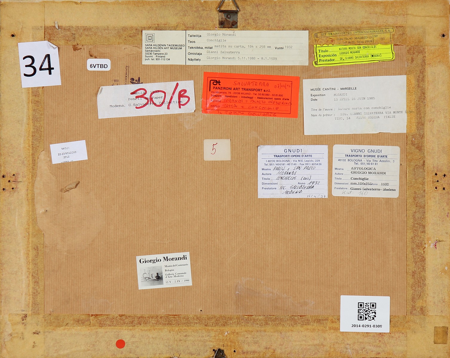 MORANDI GIORGIO (1890 - 1964) Conchiglie. 1932. Matita su carta. Cm 25,80 x 18,40. Provenienza: Collezione A. Parronchi, Firenze; Libreria Prandi, Reggio Emilia; Galleria del Milione, Milano; Collezione D. Poggioli, Lugano; Collezione privata, Modena. Esposizioni: Lugano, Villa Malpensata, Dalle collezioni d'arte private ticinesi: maestri europei del XX secolo, 1975; Madrid, Sala de Exposiciones; Barcellona, Centre Cultural, Giorgio Morandi, 1984, n. 89, illustrato; Marsiglia, Musée Cantini, Giorgio Morandi, 1985, n. 84, illustrato; Milano, Pinacoteca Nazionale di Brera; Bologna, Galleria Comunale d'Arte Moderna, Morandi: 100 opere su carta, 1985, n. 28, illustrato; Parigi, Hôtel de Ville, Giorgio Morandi, 1987, n. 66, illustrato; Massa Carrara, Palazzo Ducale, Giorgio Morandi, 1988, n. 30, illustrato; Tampere, Sara Hildénin Taidemuseo, San Pietroburgo, Museo dell'Ermitage; Mosca, Galleria Centrale dei Pittori; Londra, Accademia Italiana delle Arti; Locarno, Pinacoteca Civica Casa Rusca; Tübingen, Kunsthalle; Düsseldorf, Kunstsammlung Nordrhein-Westfalen, Progetto Morandi Europa, 1988-90, illustrato; Bologna, Galleria Comunale d'Arte Moderna, Giorgio Morandi 1890-1990. Mostra del Centenario, 1990, n. 208, illustrato Parigi, Musée Maillol; San Paolo del Brasile, MASP, Giorgio Morandi, 1996-1997, n. 160.