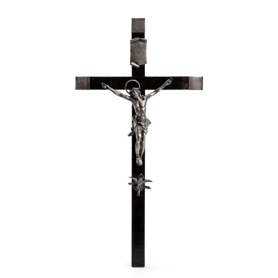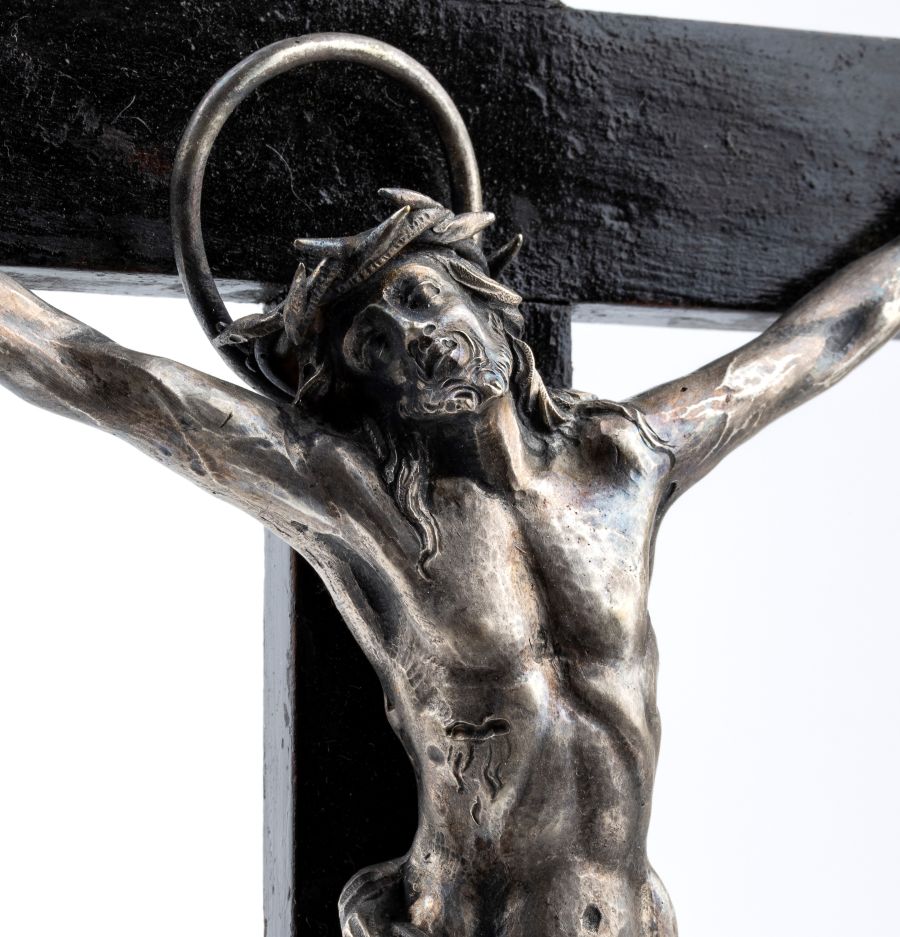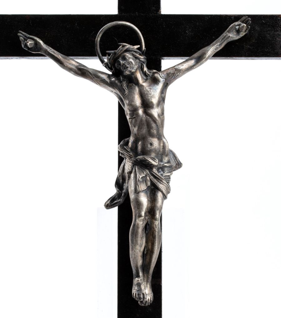 Corpus Christi in argento, posto su una croce in legno ebanizzato con terminali, cartglio e simoboli della passione in argento.