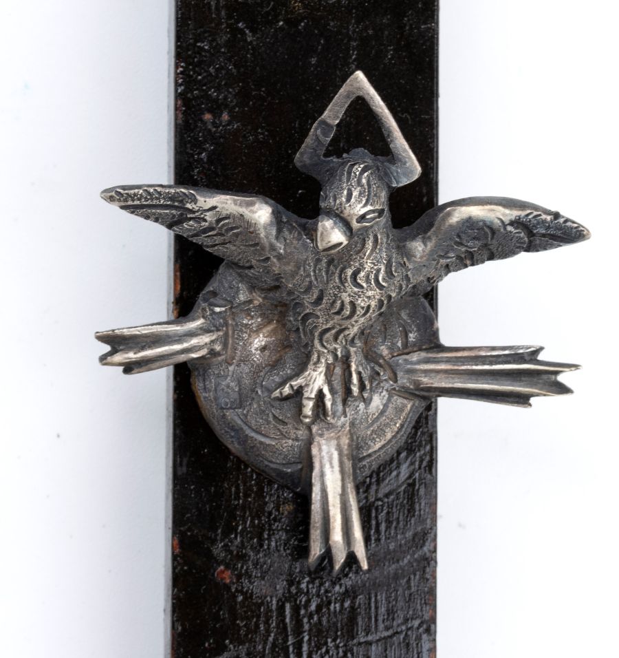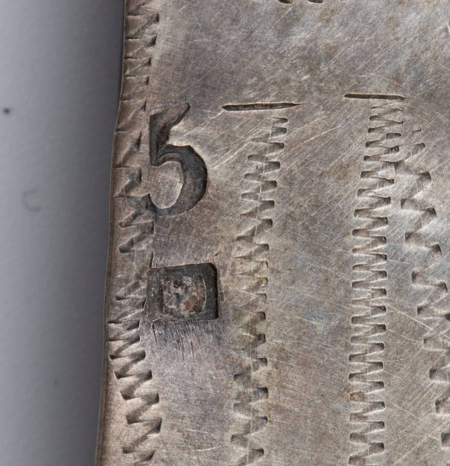 Punzonato sul Cristo, sul cartiglio e sui terminali con i marchi in uso alla corporazione degli orefici di Napoli dal 1808 al 1824 per gli oggetti in argento al titolo di 834/1000, rappresententato dalla "testa di Partenope vista di prospetto" seguita dal numero 5 e sulla colomba con il marchio in uso alla corporazione degli orefici di Napoli dal 1824 al 1832 per gli oggetti in argento al titolo di 10 once pari a 833/1000 ed 1/3 rappre3sentato dalla "testa di Partenope vista di profilo con il numero 8".