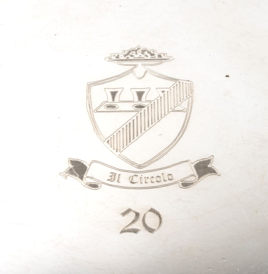 3) 2 piattini con stemma inciso al centro, in argento al titolo minimo di 800/1000, punzonati "800". Dimensioni: 13,5 x 13,5 cm.