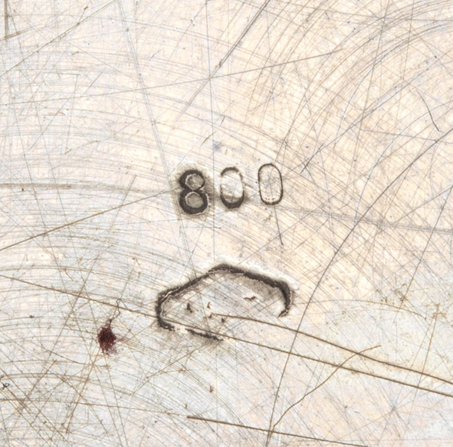 4) un piattino con data incisa al centro, in argento al titolo minimo di 800/1000, punzonato "800". Dimensioni: 15 x 15 cm.