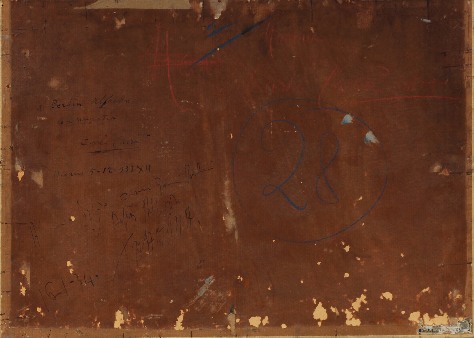 CARRA' CARLO (1881 - 1966) Porto e barche. 1929. Olio su tela cartonata. Cm 44,50 x 31,00. Firma in basso a sinistra e datato 29. Al retro riporta la scritta: A Bordin Alfredo con simpatia Carlo Carrà Milano 5-12-933 XII; a mio figlio [...] Gianni Bordin, il papà Alfredo TA HO MA. Opera archiviata presso l'Archivio Carrà, Milano, come da documentazione fotografica allegata all'opera riportante il relativo numero di repertorio. Cornice presente
