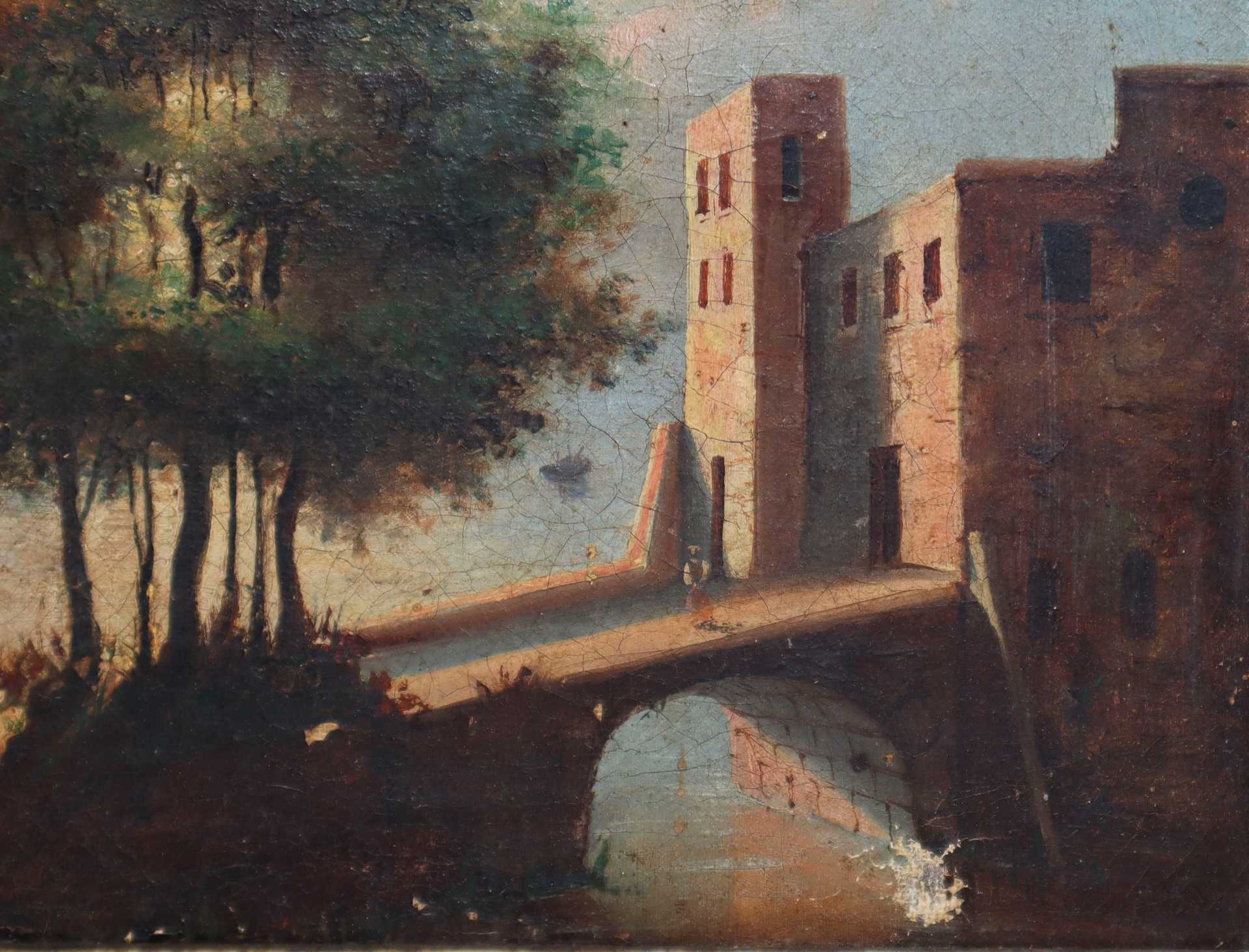 Paesaggio con ponte e alberi, 19° secolo painter Cm 18 x 27 Olio su tela