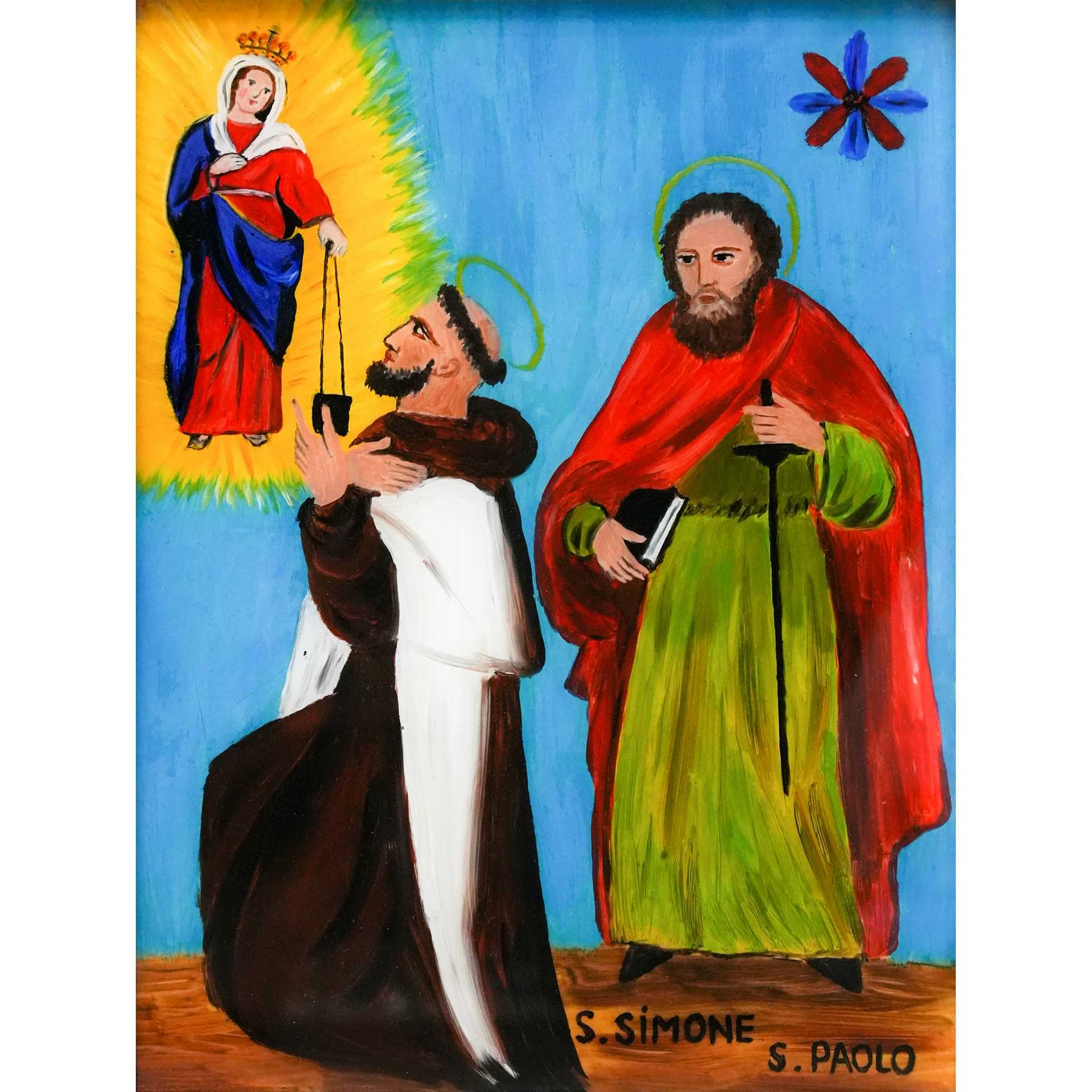 Santi Simone e Paolo davanti alla Madonna, 20° secolo H cm 27x20,5 - in cornice H cm 33,5x26,8 Pittura su vetro
