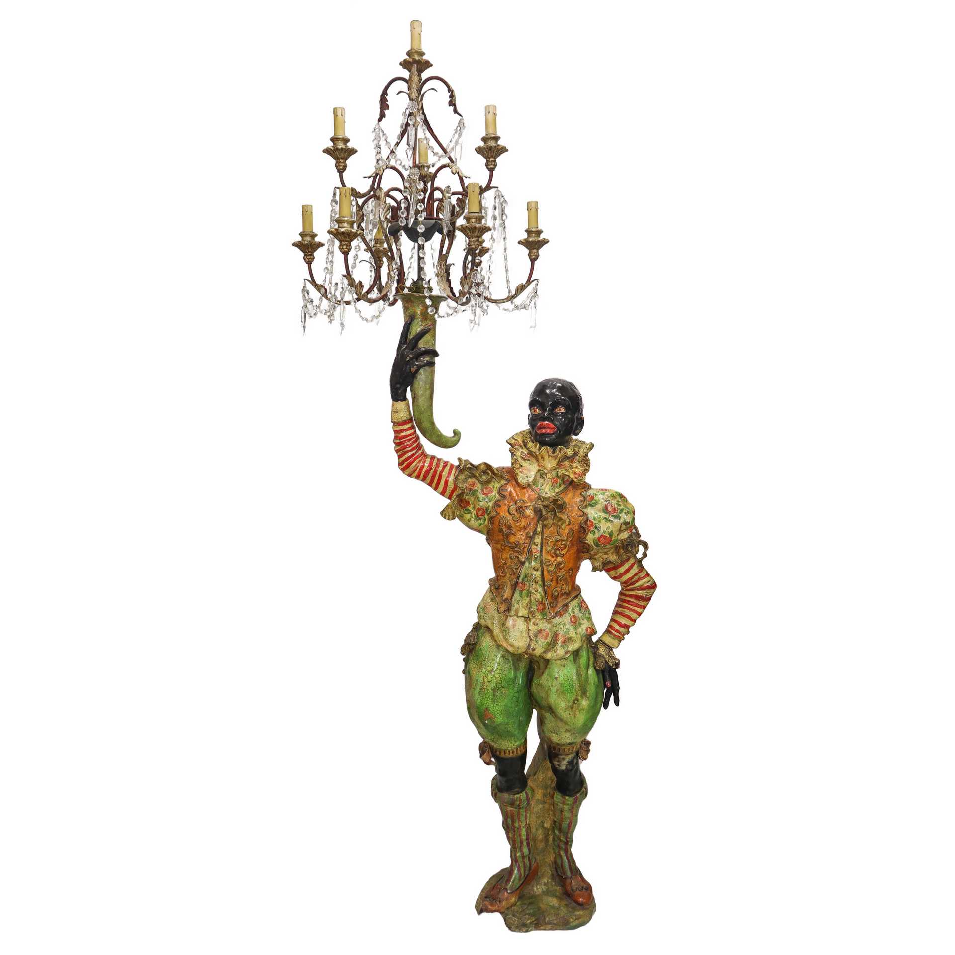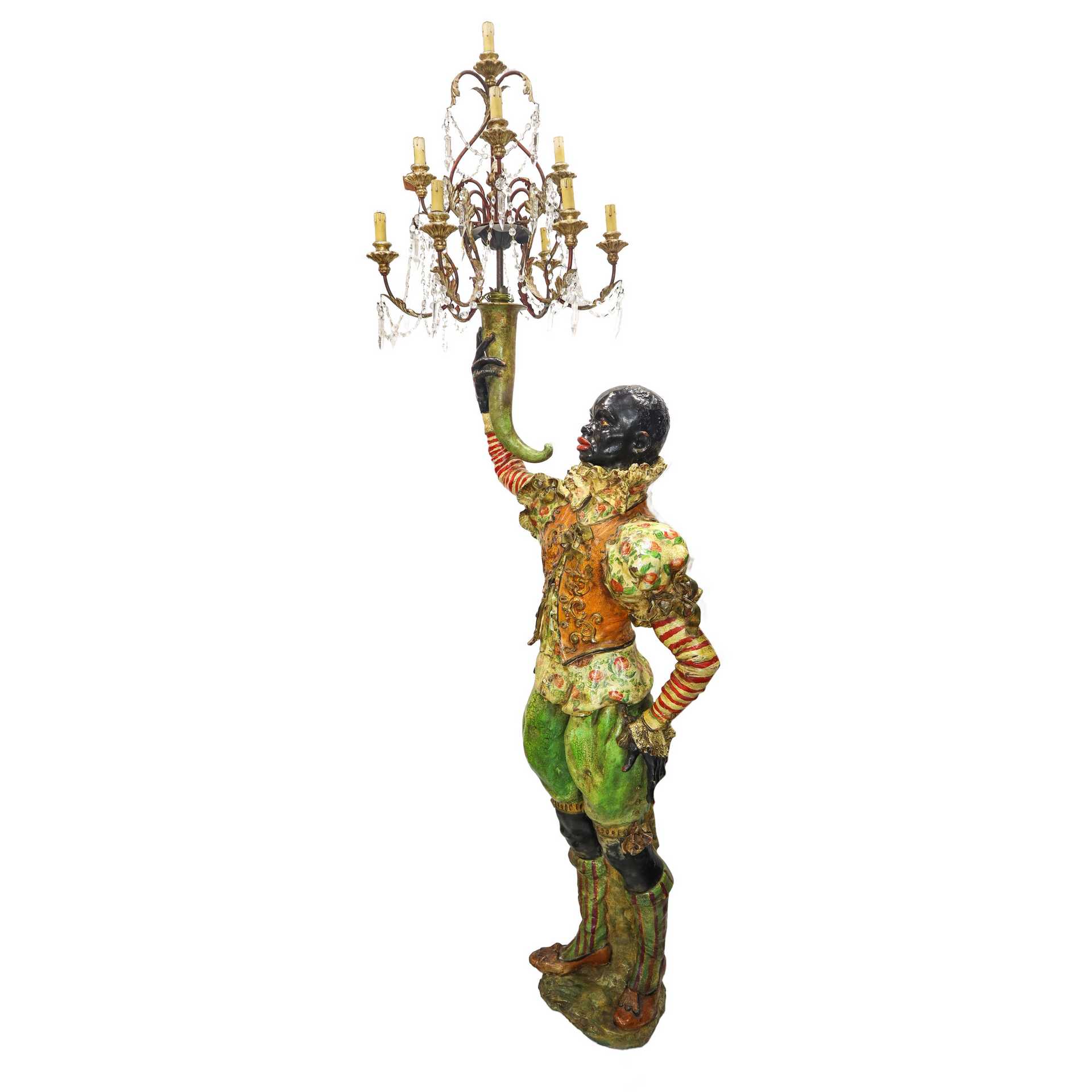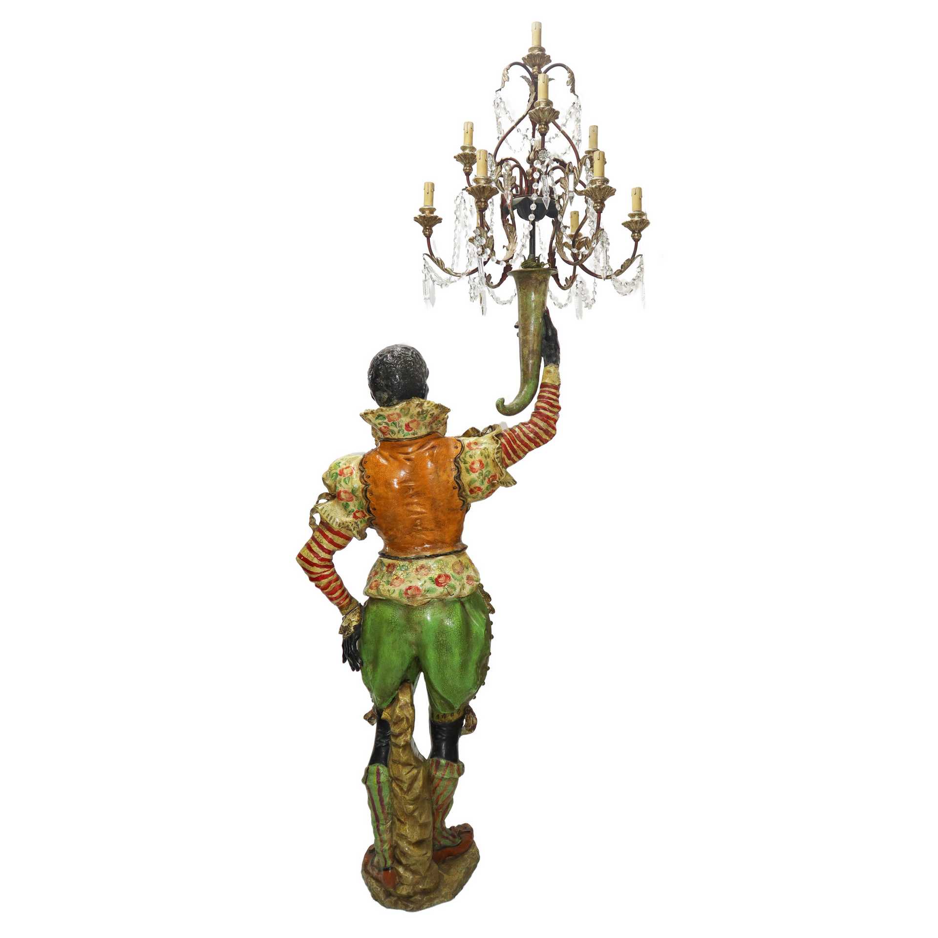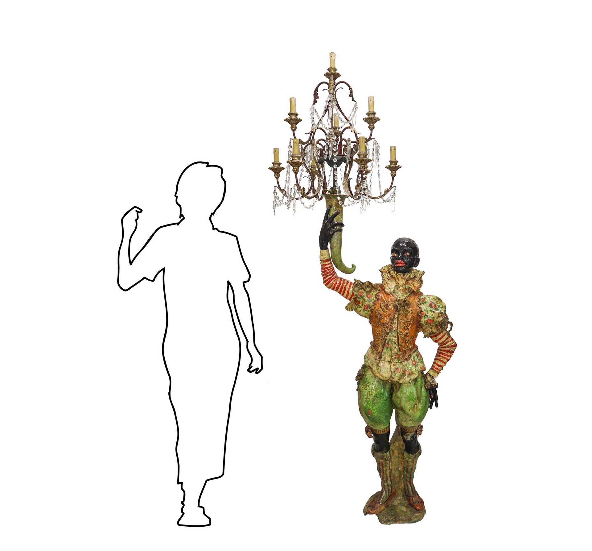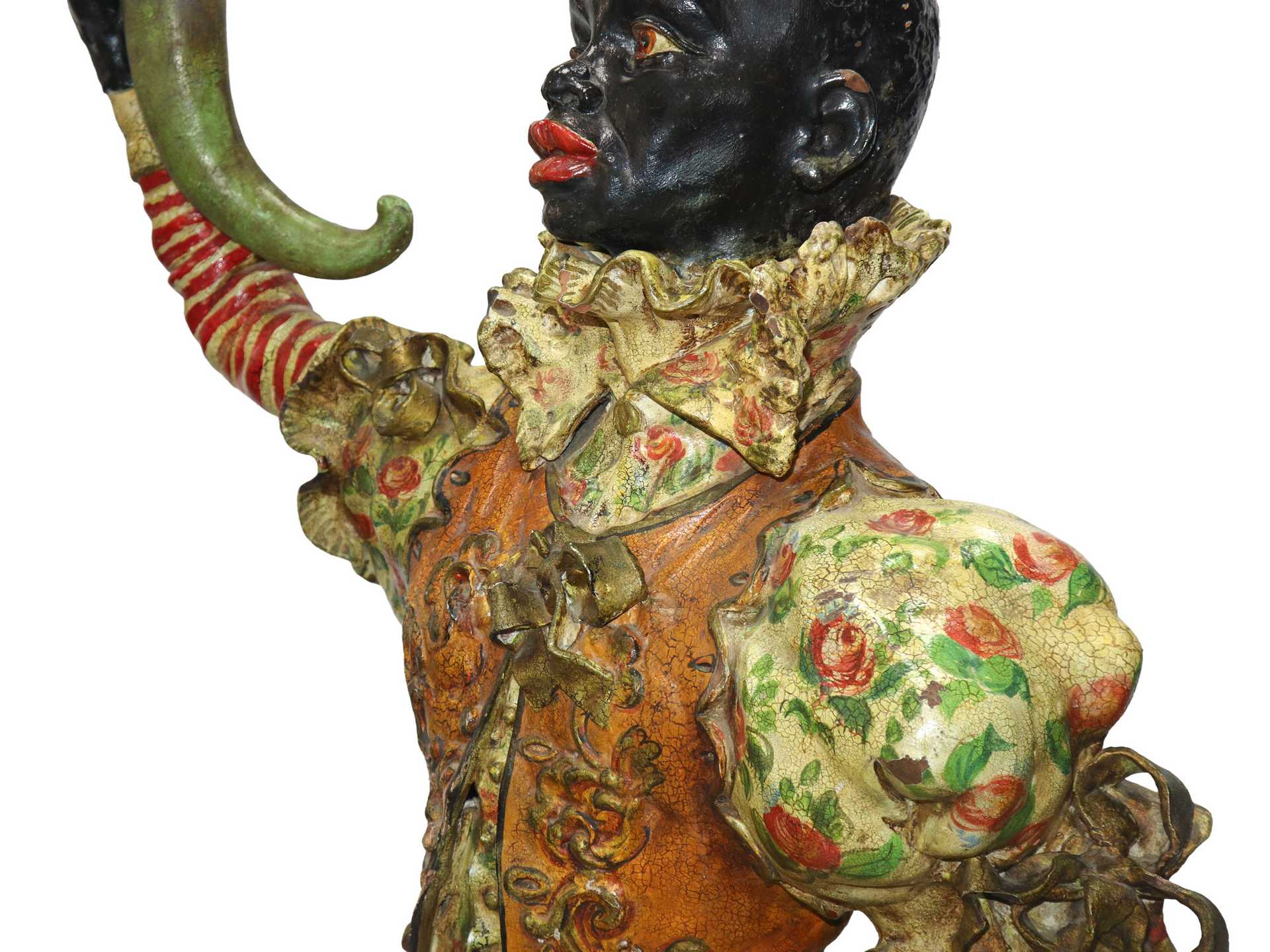 Moro veneziano reggilume in ceramica policroma con lampada: h cm 221X95 senza lampada h cm 159X75 Il moro si compone di tre pezzi componibili: busto, gambe e lampada a 10 luci. Mancanza alla base, incollatura sul busto.Il moro si compone di tre pezzi componibili: busto, gambe e lampada a 10 luci. Mancanza alla base, incollatura sul busto.