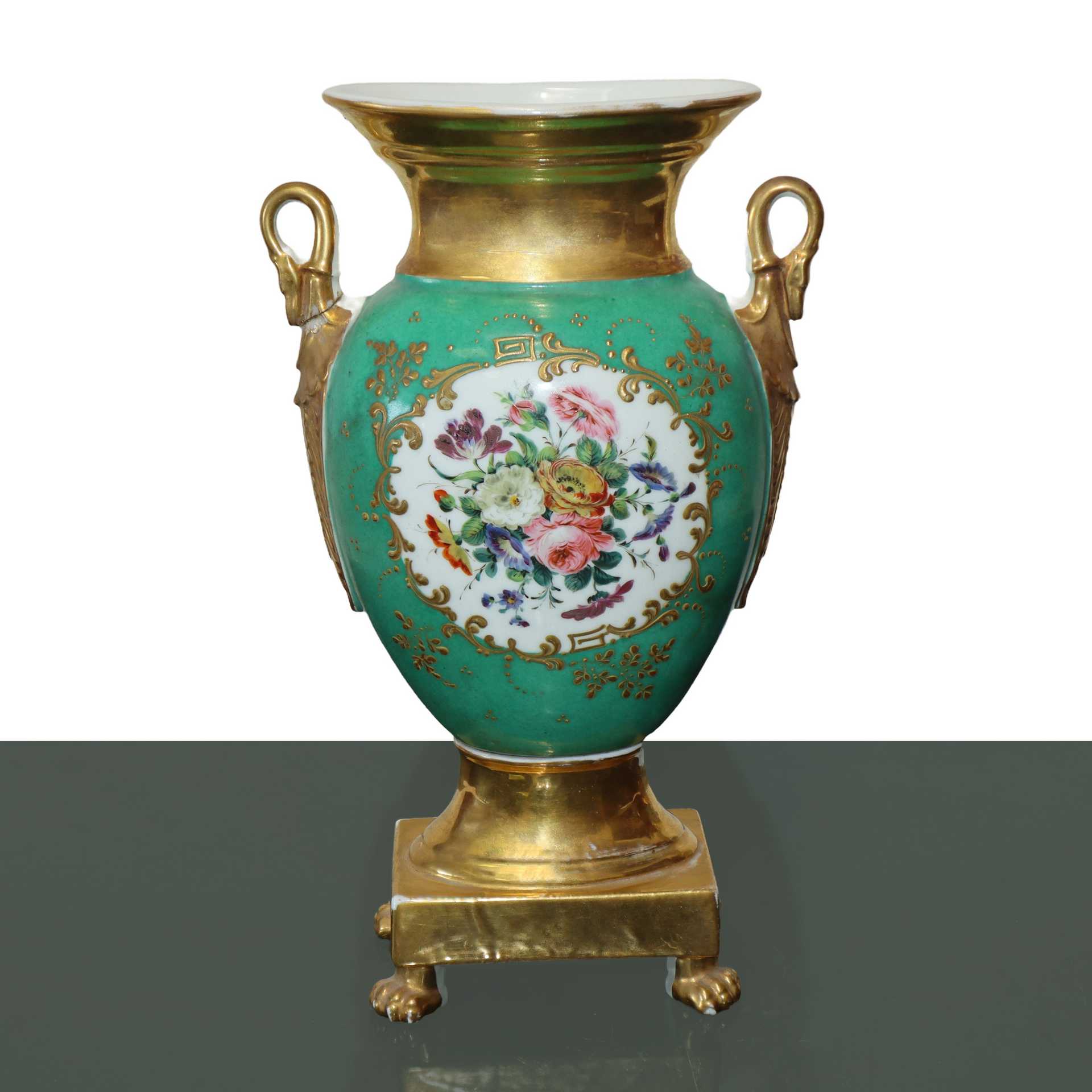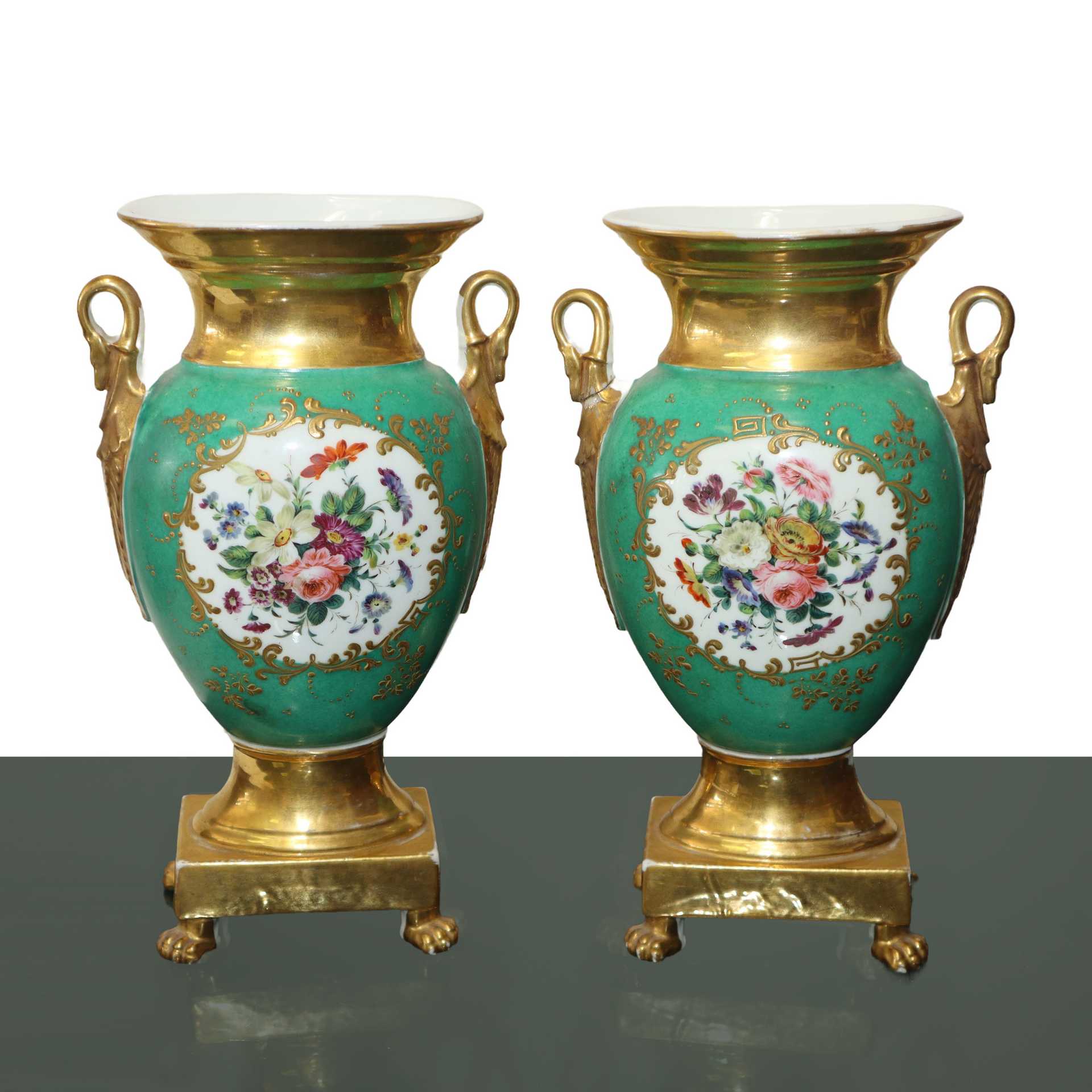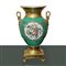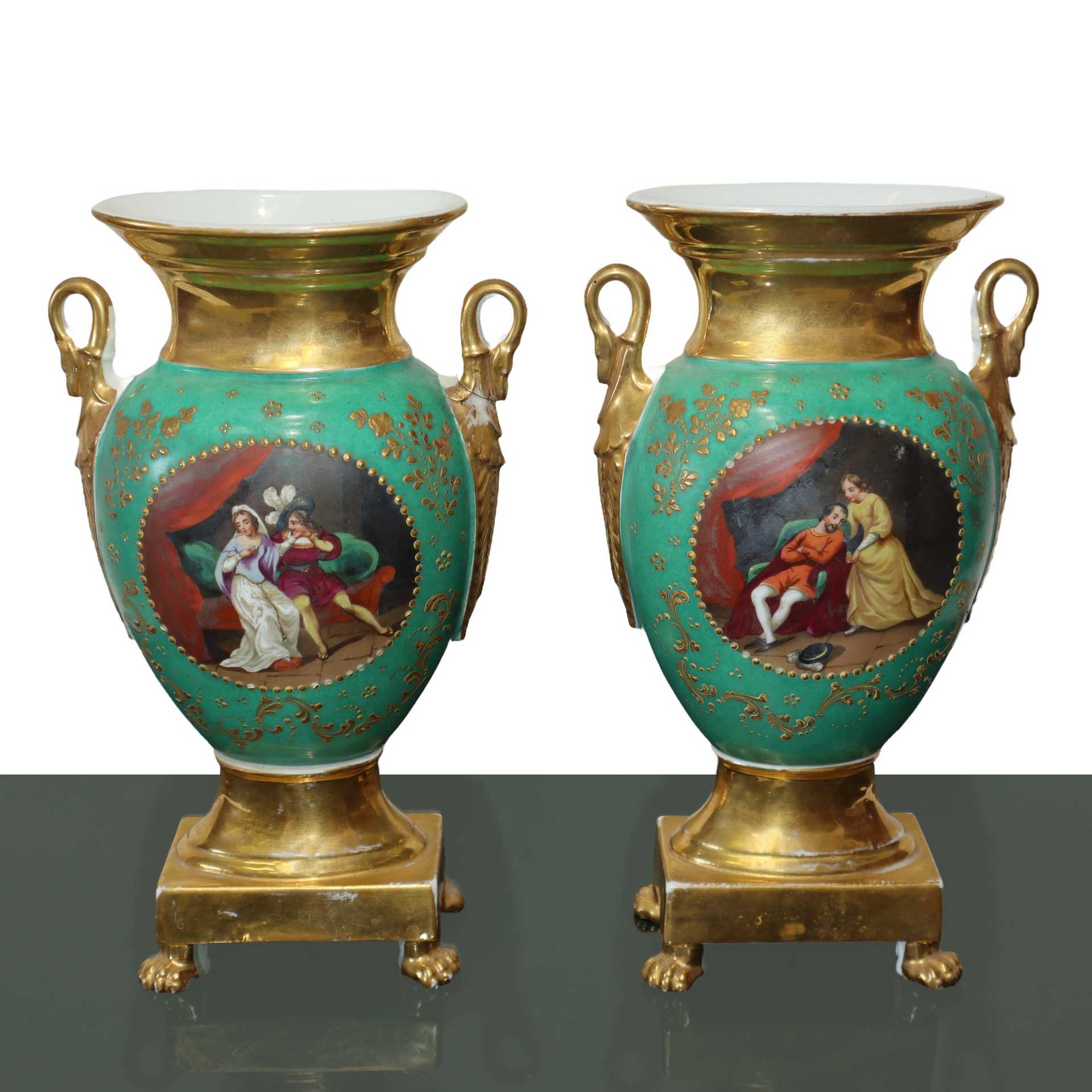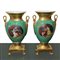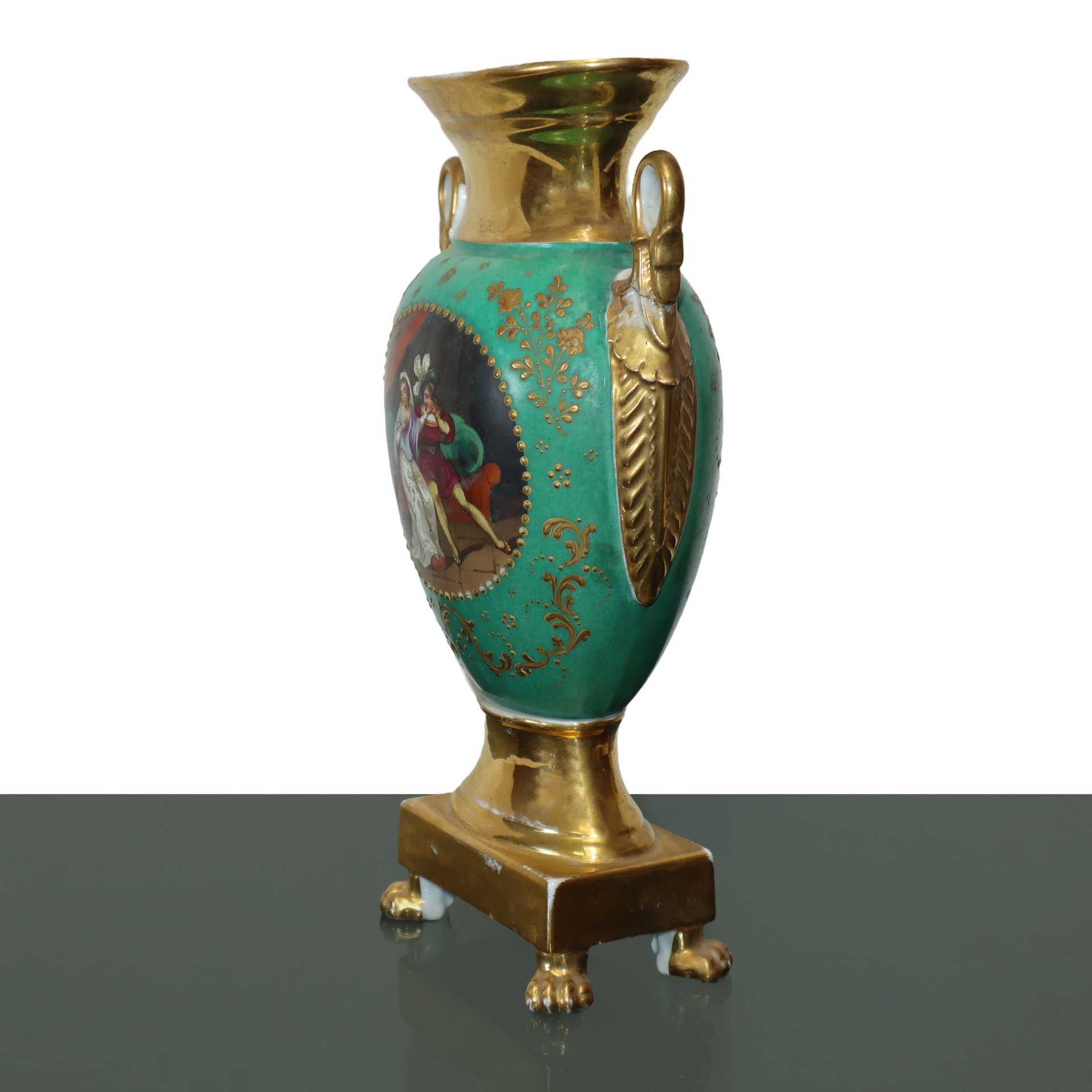 Coppia di vasi Vecchia Francia Impero verdi e dorati su base dorata con piedi leonini h cm 26X16 Presente su uno dei due sbeccatura alla base e presente piccola incollatura.Presente su uno dei due sbeccatura alla base e presente piccola incollatura.