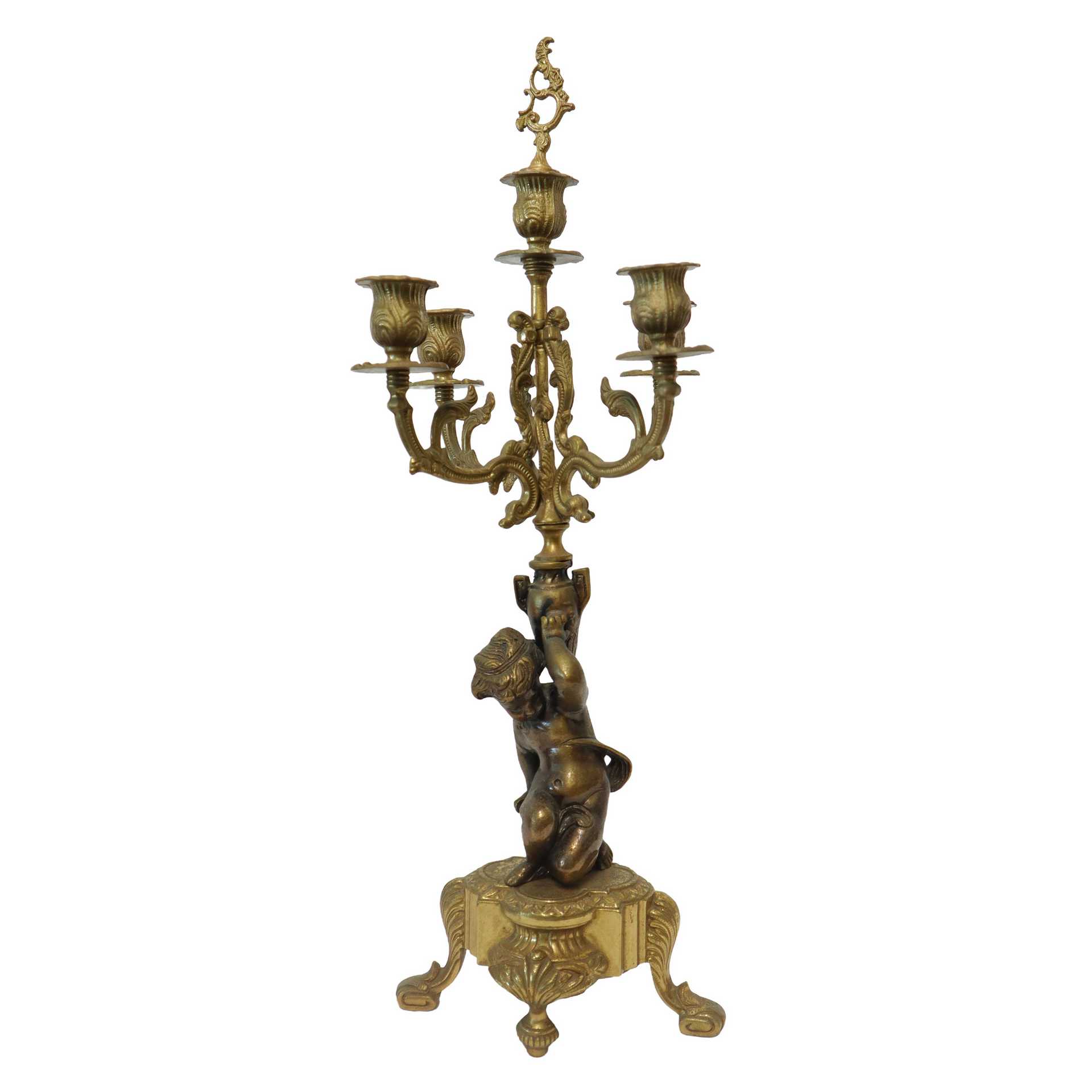 Trittico composto da orologio da tavolo in bronzo patinato oro con putti ai lati, quadrante in porcellana firmato Imperial e coppia di candelieri in bronzo patinato oro a cinque luci retti da basi con putti, nineteen° secolo