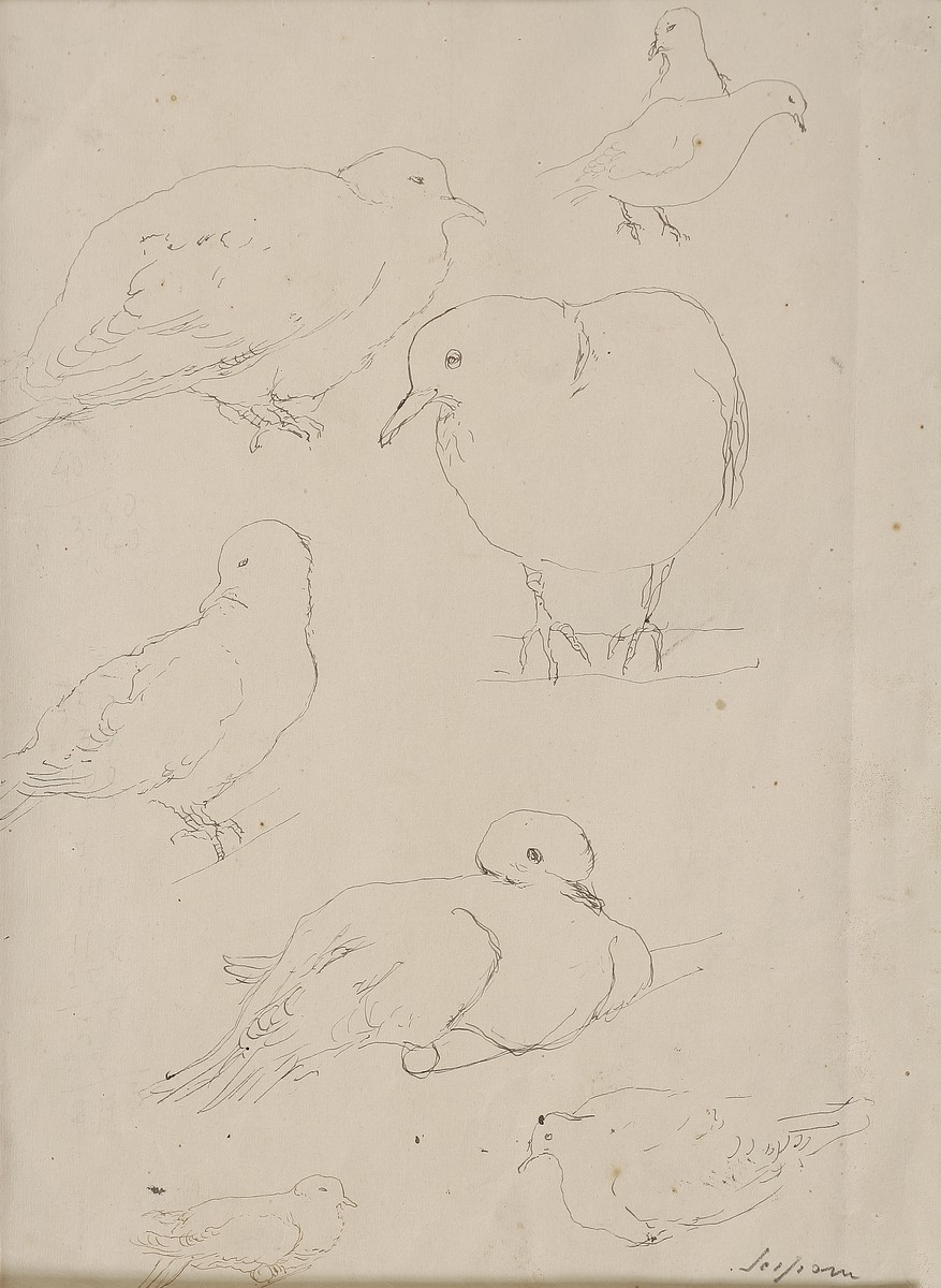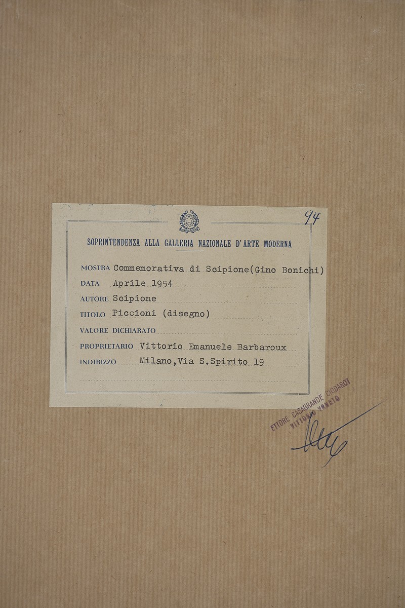 BONICHI GINO (SCIPIONE) (1904 - 1933) Studio per colombe. China su carta. Cm 21,50 x 29,50. Firma in basso a destra. Al retro autentica del fratello Alberto Bonichi e cartiglio della mostra commemorativa di Scipione ( Gino Bonichi) . Pubblicato in Palma Bucarelli (a cura di), Mostra di Scipione alla Galleria Nazionale di Arte Moderna, De luca editore, 1954, n 94; Giuseppe Appella, 306 disegni di Scipione, edizione La Cometa, 1984, pagina 157, n 153 con misure errate.