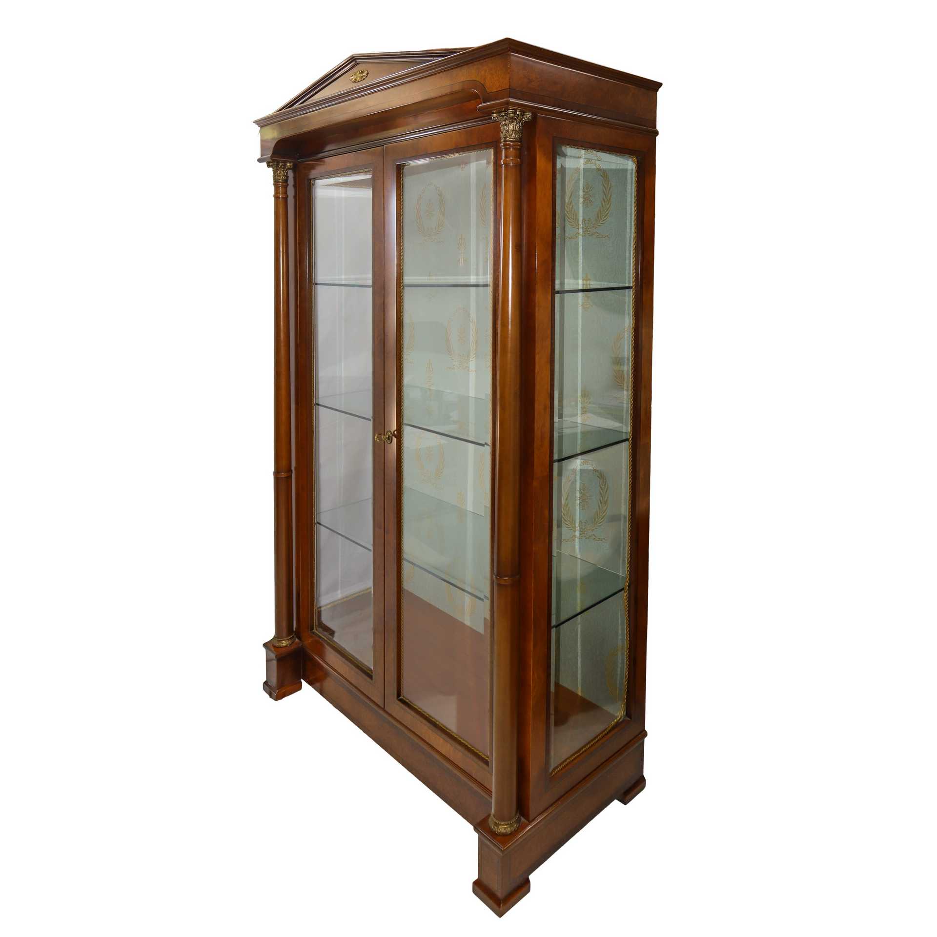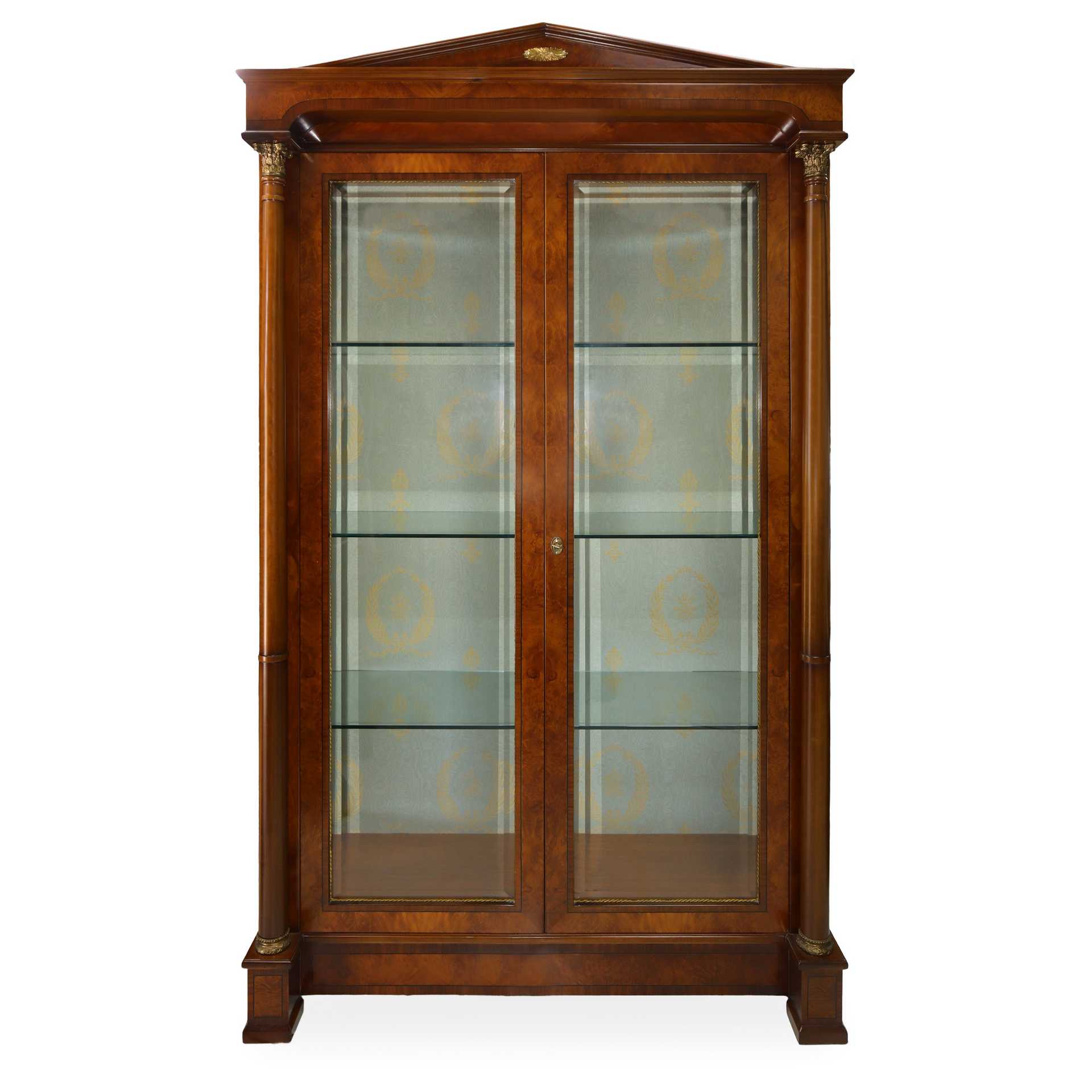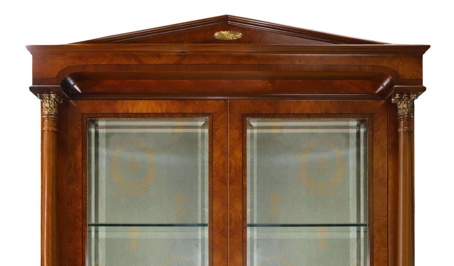 Vetrina nello stile Biedermeier in legno di acero con perfili bois de rose, colonne con base e capitelli dorati ai lati, sormontata da timpano, primi 20° secolo