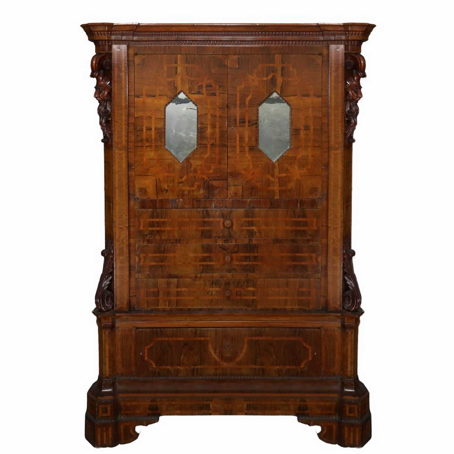 Piccola Sciffoniera in legno, 19° secolo Sicilia h cm 178 x 125 x 57 Con inserti di Boise de rose, corpo unico parte superiore a due sportelli con specchi centrali a losanga, parte inferiore con tre cassetti più cassetto alla base più grande ,sculture con mascheroni intagliati a foglie ai lati, piedi a mensola.Con inserti di Boise de rose, corpo unico parte superiore a due sportelli con specchi centrali a losanga, parte inferiore con tre cassetti più cassetto alla base più grande ,sculture con mascheroni intagliati a foglie ai lati, piedi a mensola.