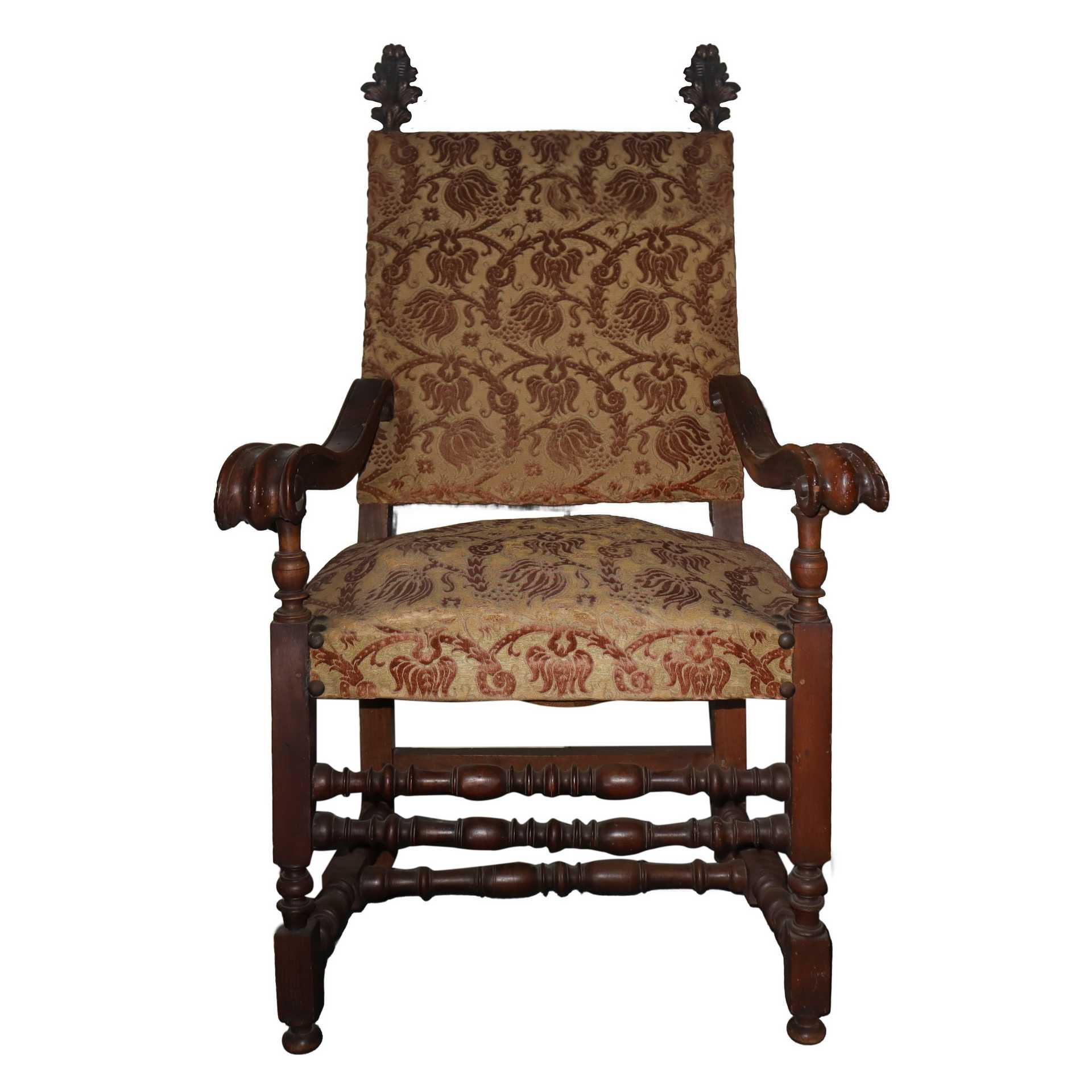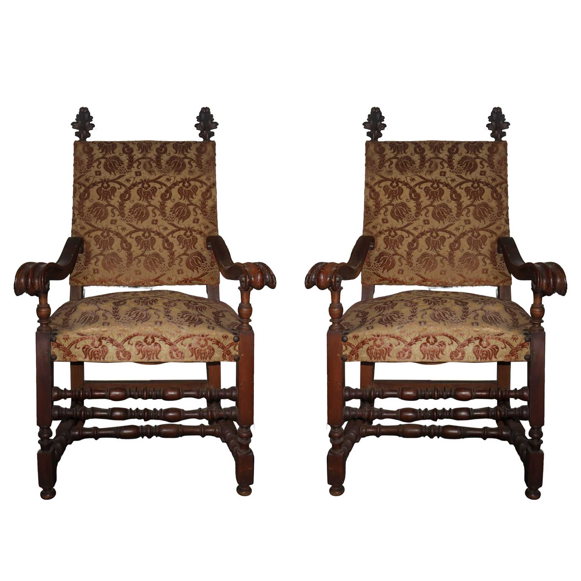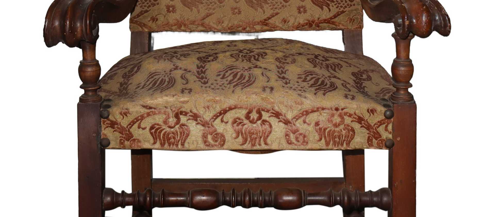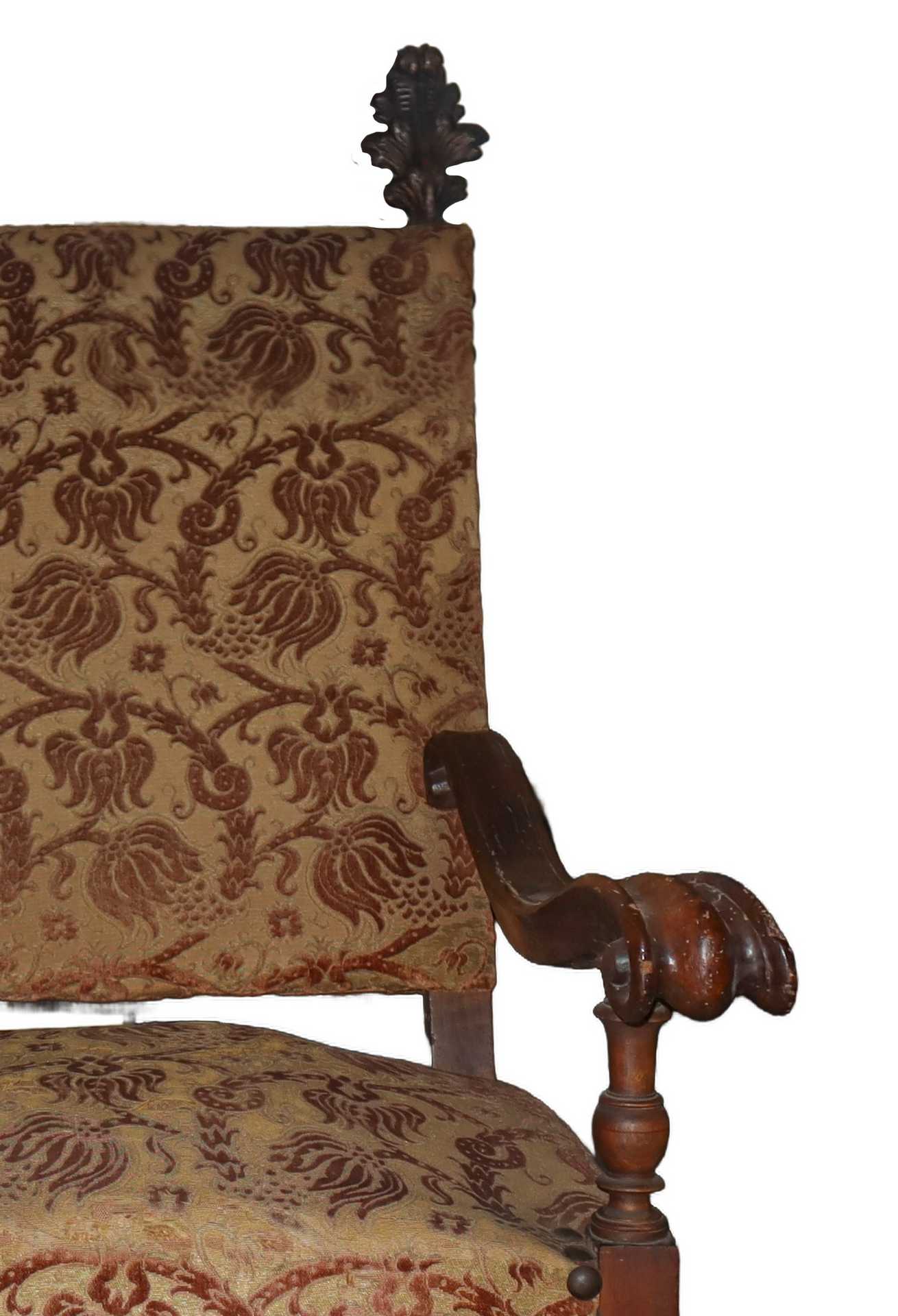 N.2 Poltrone a sediolone Luigi XV, 18° secolo h cm 131 x 76 x 66 Con braccioli a riccioli e spalliera retta con finali ai lati a foglia d'acanto, legacci a rocchetto , tappezzeria in velluto damascato. Con braccioli a riccioli e spalliera retta con finali ai lati a foglia d'acanto, legacci a rocchetto , tappezzeria in velluto damascato.