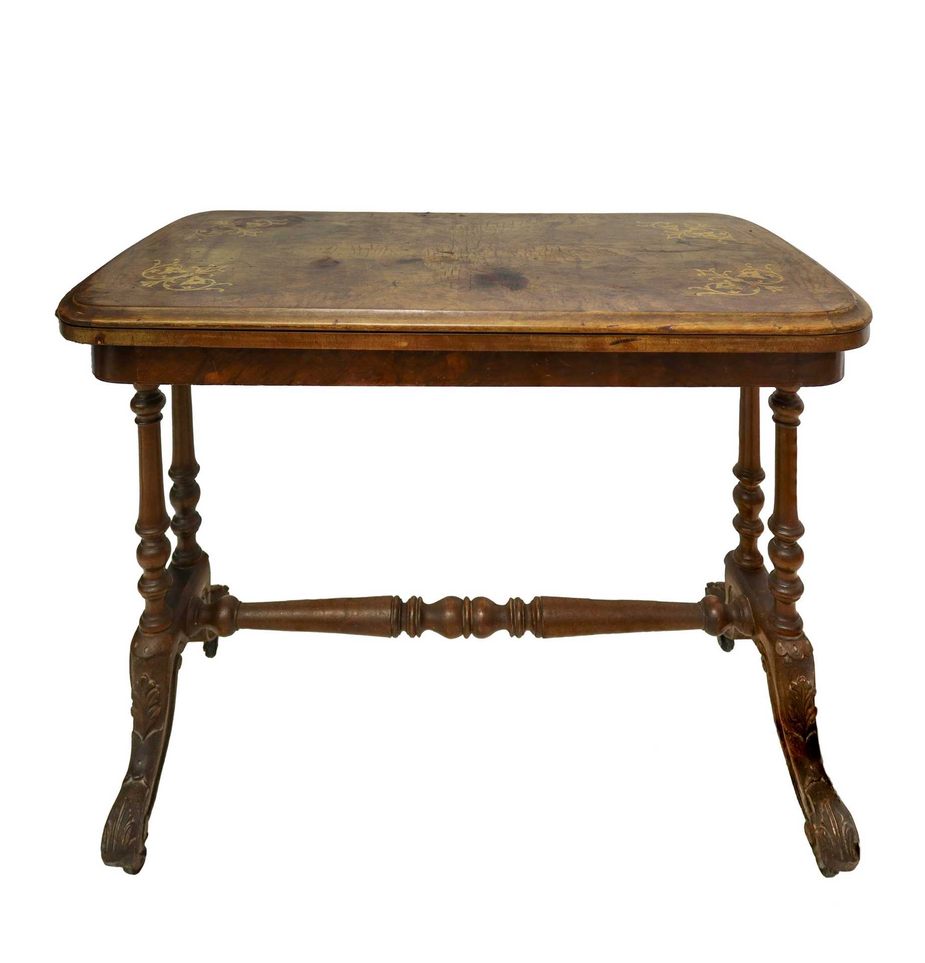 Tavolo da gioco rettangolare pieghevole, nineteen° secolo H cm 70x91x47, aperto cm 94x91 In legno di noce con piano in radica e intarsi a ghirlande floreali agli angoliIn legno di noce con piano in radica e intarsi a ghirlande floreali agli angoli