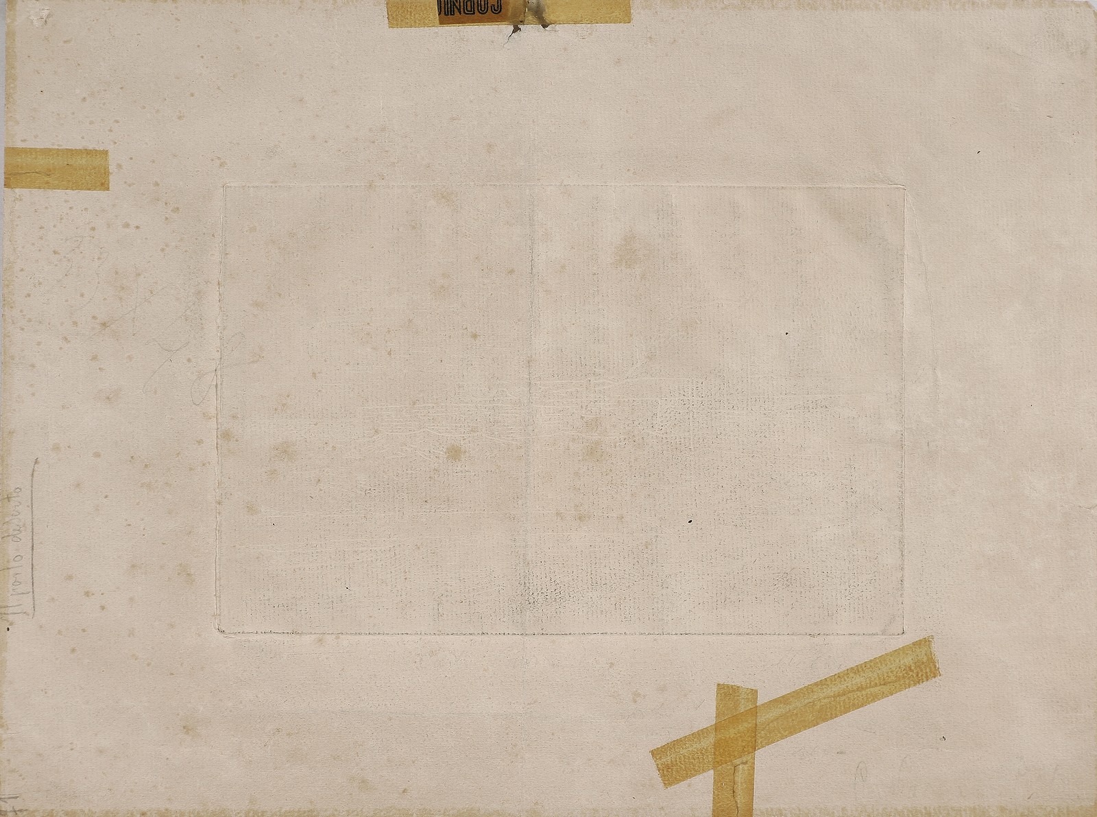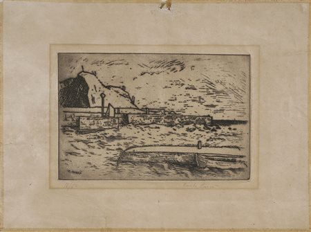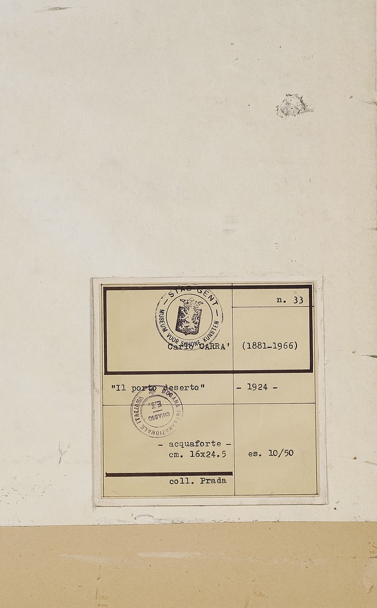 CARRA' CARLO (1881 - 1966) Il porto deserto. 1924. Acquaforte. Cm 30,00 x 40,00. 10/50. Dimensioni lastra:16x24,5 cm. Firma e tiratura in basso a matita. Mancanza della carta in corrispondenza del margine superiore nella zona centrale e tre strappi su ognuno degli altri margini. Al centro presenta un piegatura unica in senso verticale. Al retro riporta sul passpartout il cartiglio del Museum Voor Schone Kunsten, Stad Gent. Cornice presente