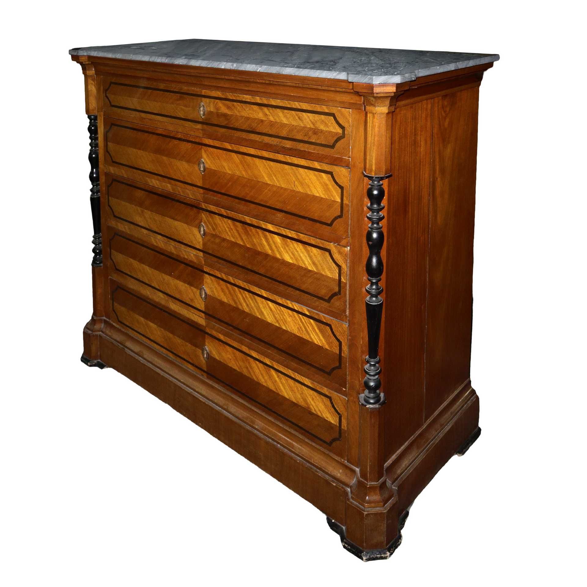 Cassettone a cinque cassetti in legno di mogano., nineteen° secolo H cm 125x144x61 Con piano in marmo grigio bardiglio e colonne ai lati. Impellicciato sul fronte a spina di pesce entro riserve geometiche rettangolari Con piano in marmo grigio bardiglio e colonne ai lati. Impellicciato sul fronte a spina di pesce entro riserve geometiche rettangolari