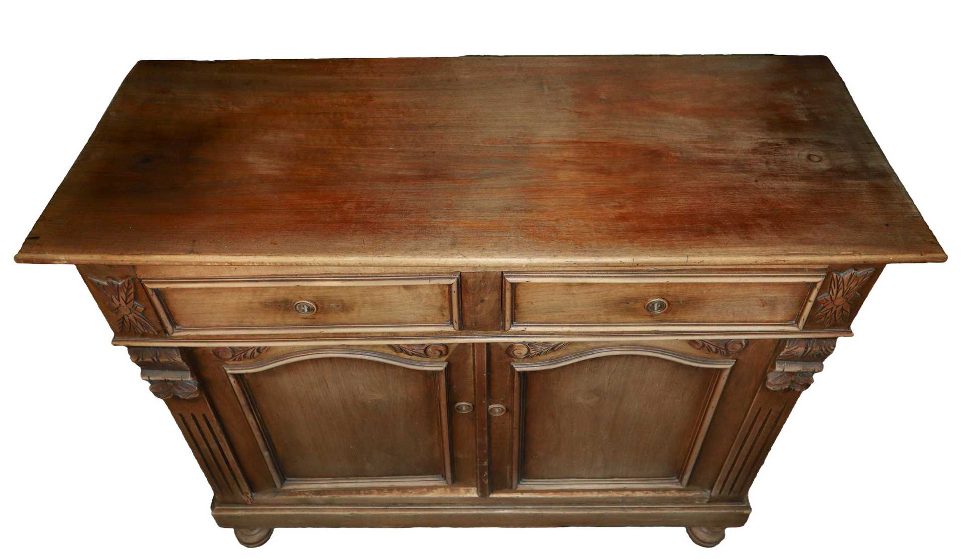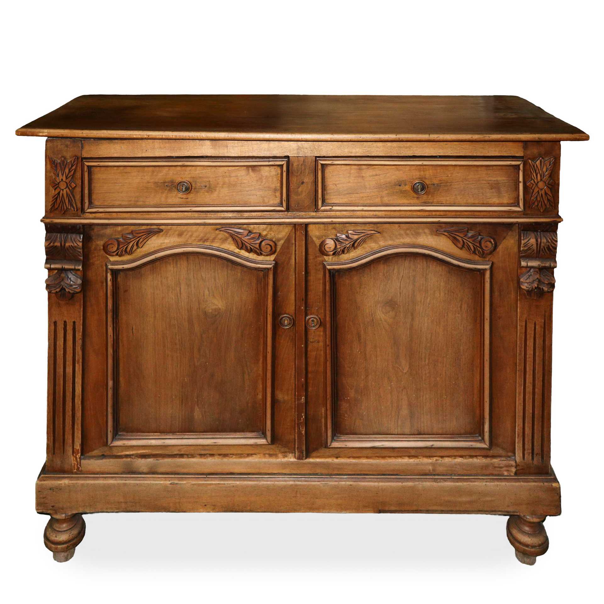 Credenza bassa in legno di noce con due cassetti sottopiano e due sportelli, primi 20° secolo H cm 101x120x47  Intagli floreali applicati e lesene con capitelli ai lati. Intagli floreali applicati e lesene con capitelli ai lati.