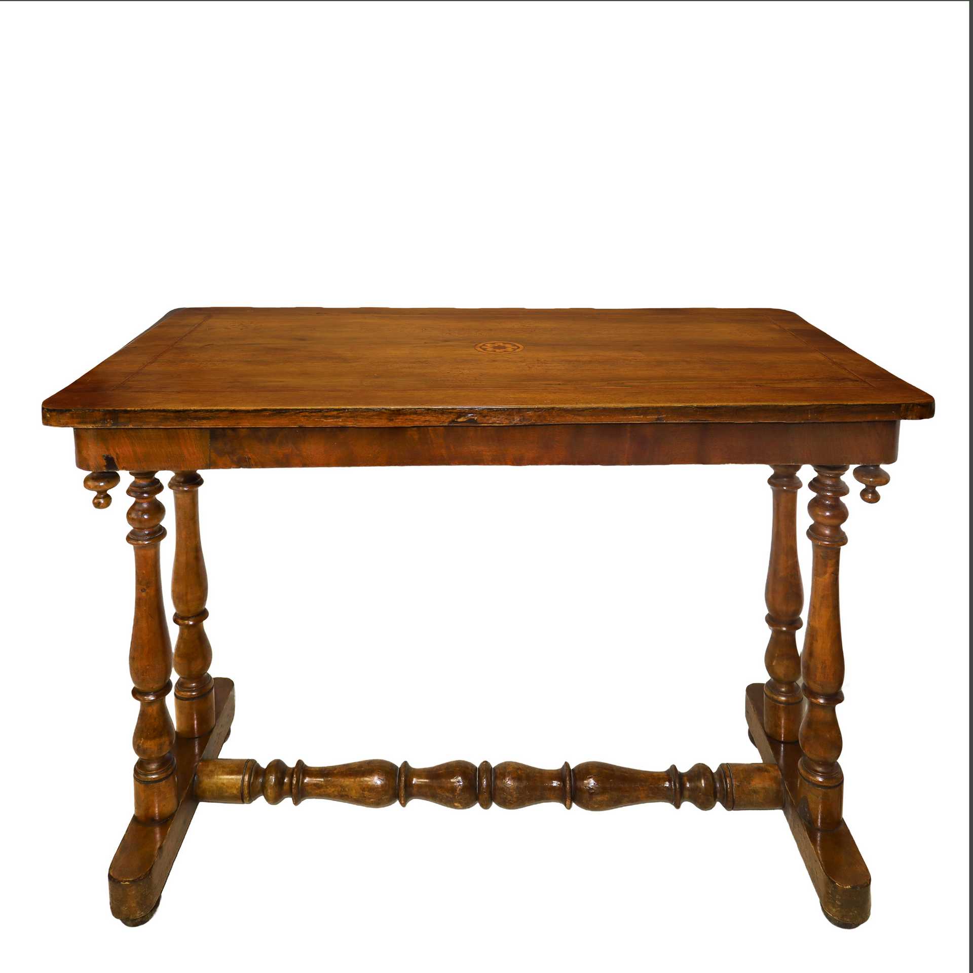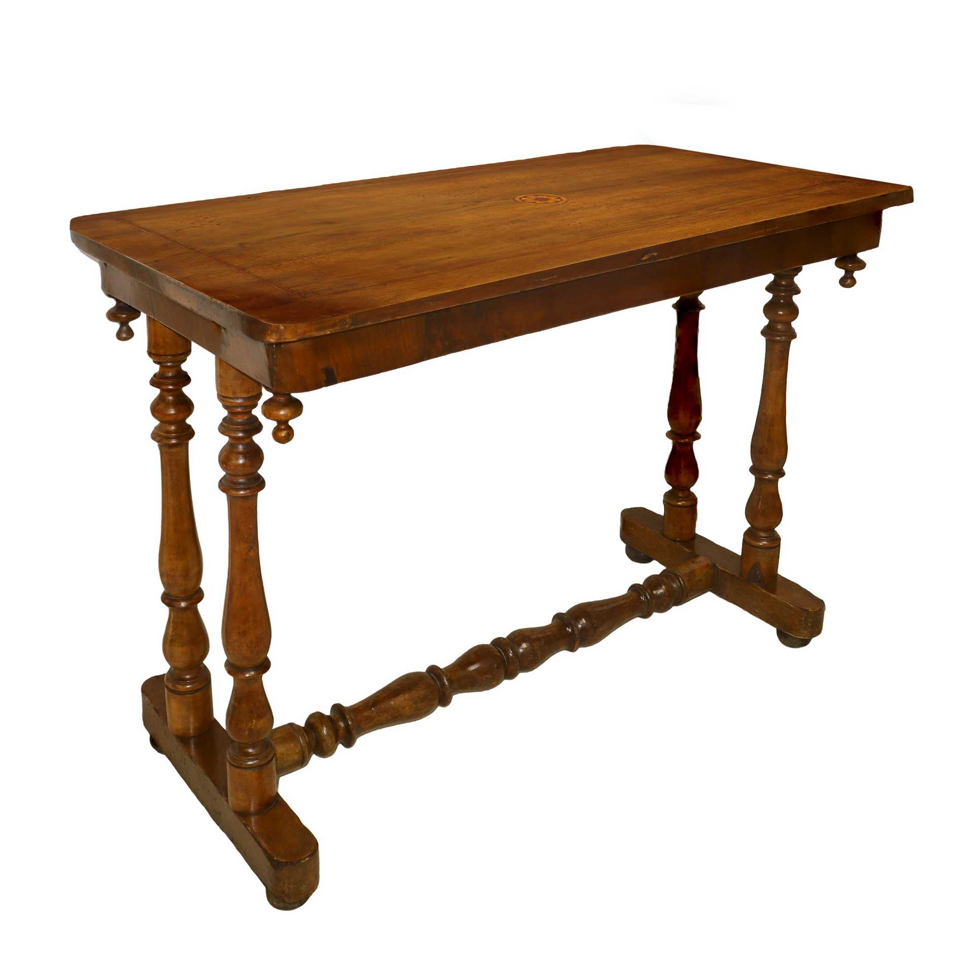 Tavolinetto rettangolare con piano, fine 19° secolo H cm 63x89x44 Con intarsio a fiore centrale e quattro gambe tornite raccordate a traversa. Piedini a cipollaCon intarsio a fiore centrale e quattro gambe tornite raccordate a traversa. Piedini a cipolla